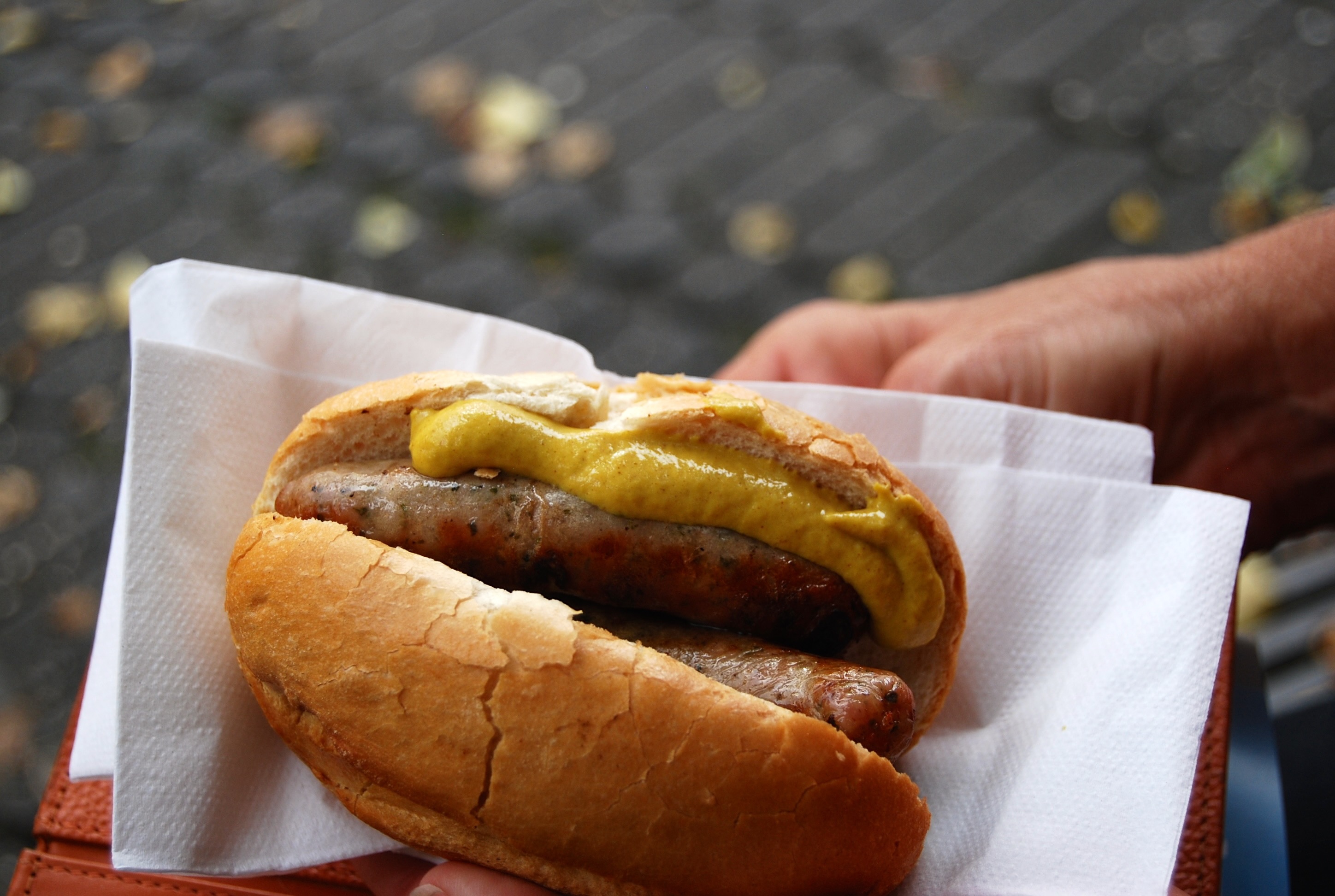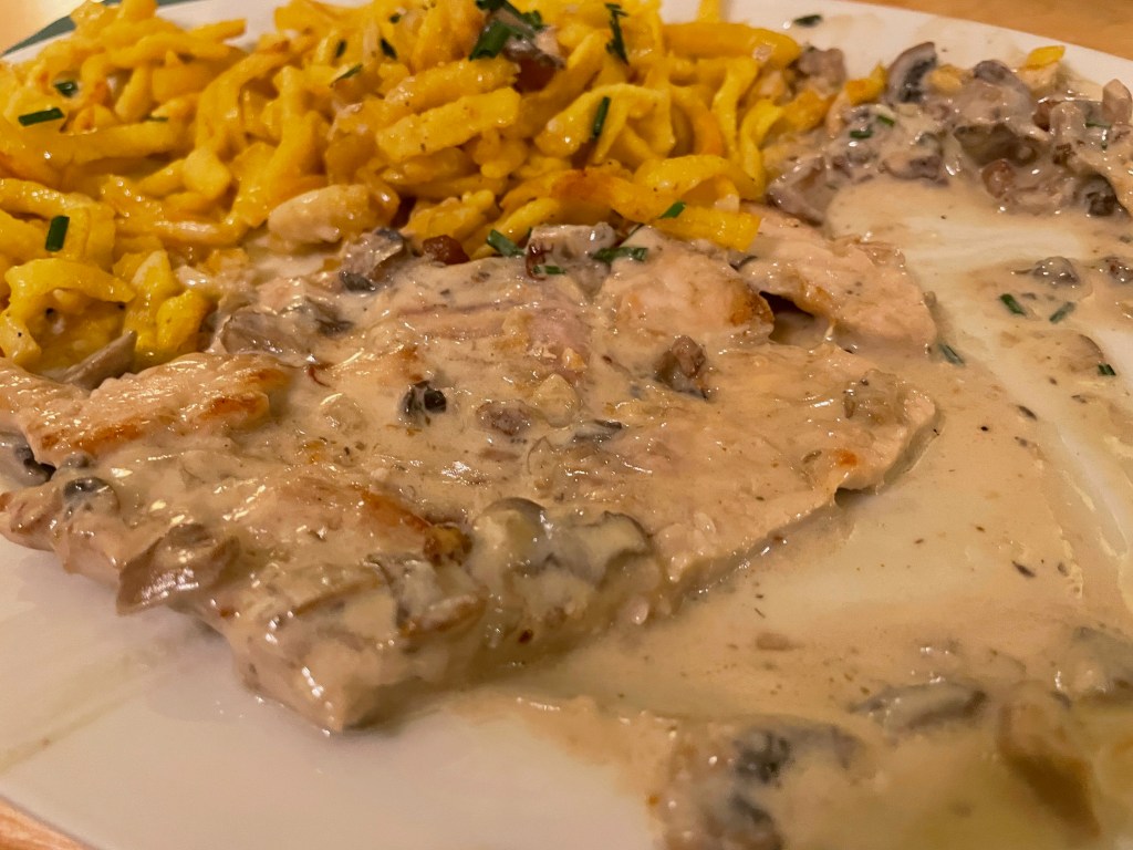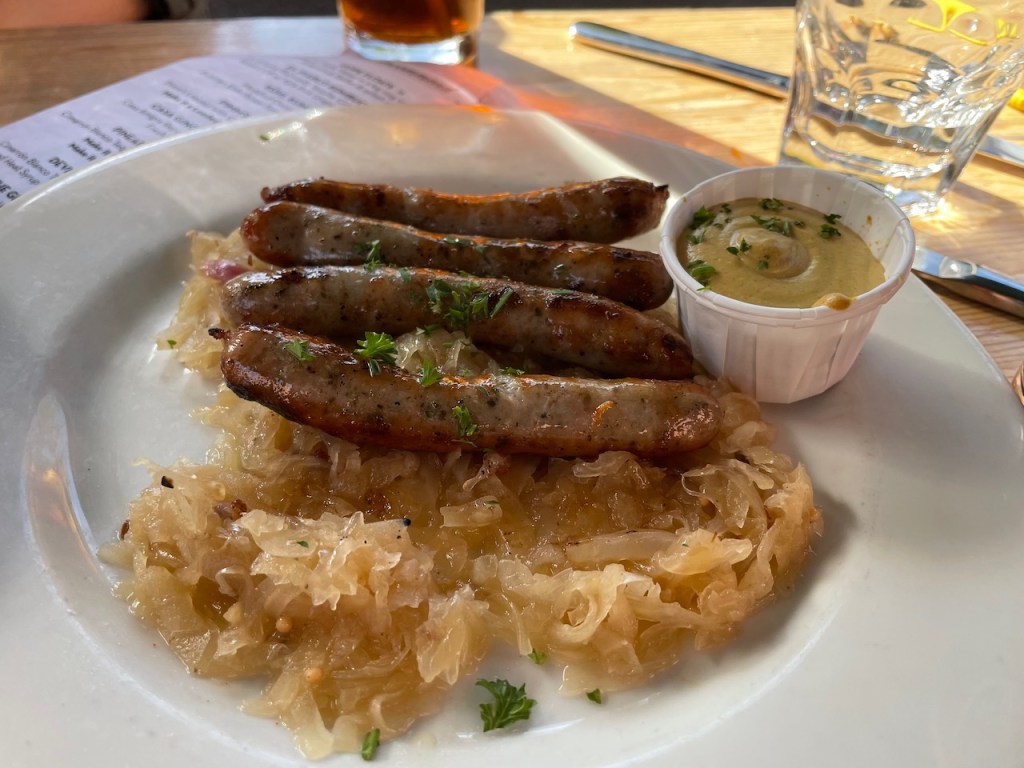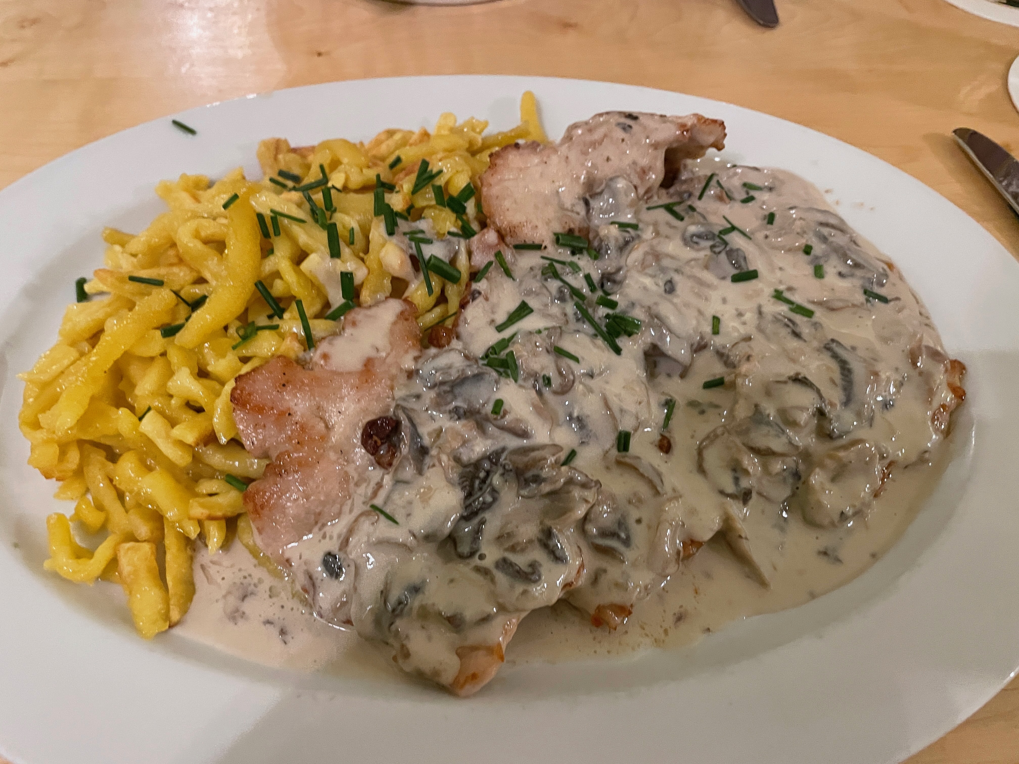 Next up would be a Jager Schnitzel (hunter style) for me and a favorite we get whenever we can find them, Nurenberger sausages for Joanna. Followers of the blog will recognize our love of these small, thin and light in color beauties, which are produced with pork without tendons and rind. They often include bacon, are flavored with marjoram and because of their petite size, made with sheep casing instead of hog casing. The Nürnberger Rostbratwurst is protected throughout the European Union as a “protected geographical indication” (PGI). This means that products sold by that name within the EU can only be produced in the city of Nuremberg.