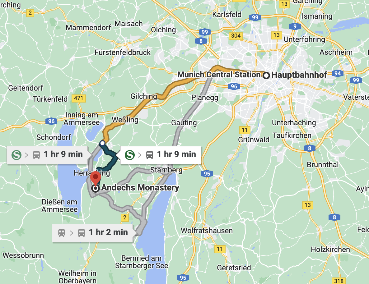 We simply walked to the Underground at Sendlinger Tor, hopped on the train there to the Hauptbahnhof where we picked up the S8 which took us to the end of the line at Hechendorf where I boarded the 928 bus that took me up to the Monastery. In the meantime, Joanna opted to walk the five miles from town, which took her just about an hour.