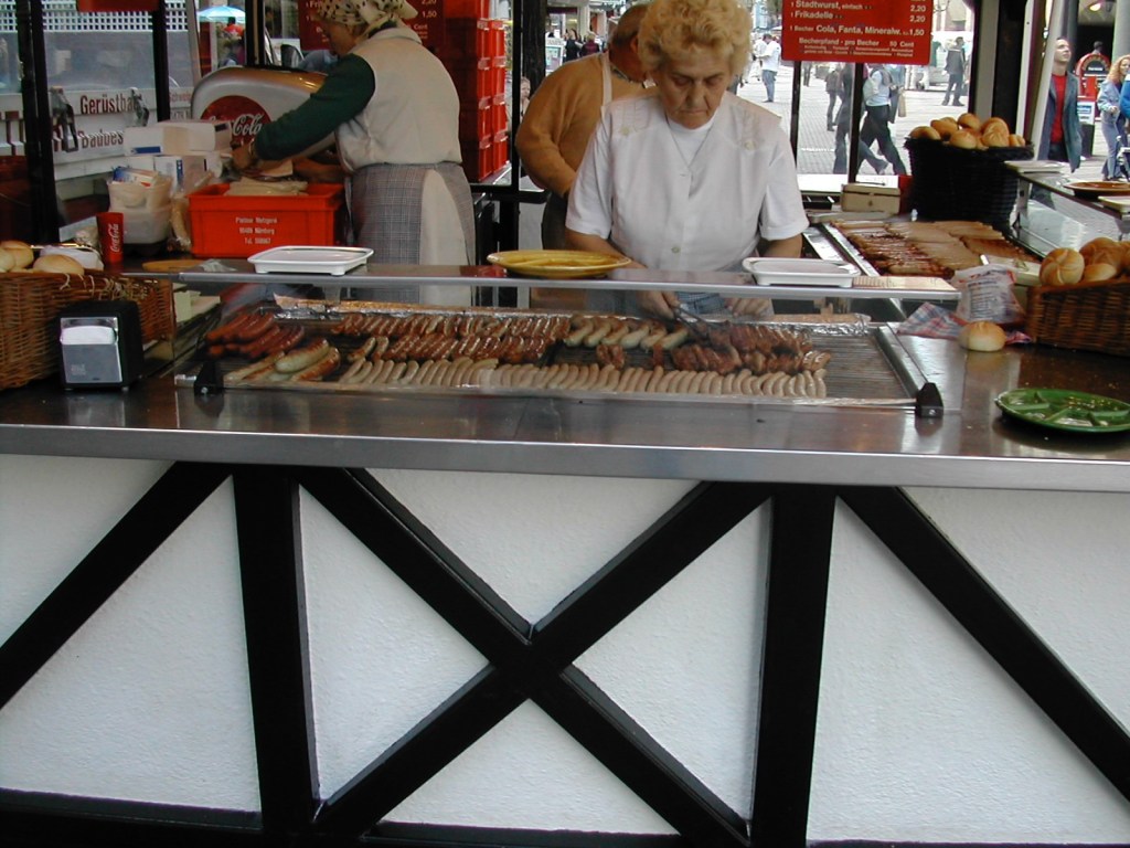 We queued up in the small space where one purchases their beer a beer station and food from the deli like outlet. Joanna ordered a half liter of the Export Dunkel while I opted for the larger and significantly more refreshing liter of Helles, the German version of our familiar lager. Helles, which simply means “bright” in German, is indeed a bright, malty alternative that retains the crispness of a lager without the spicy hops found in a pilsner. Like all lagers, Helles is made with a unique yeast variety, so it’s distinguished from ales during the fermentation process.