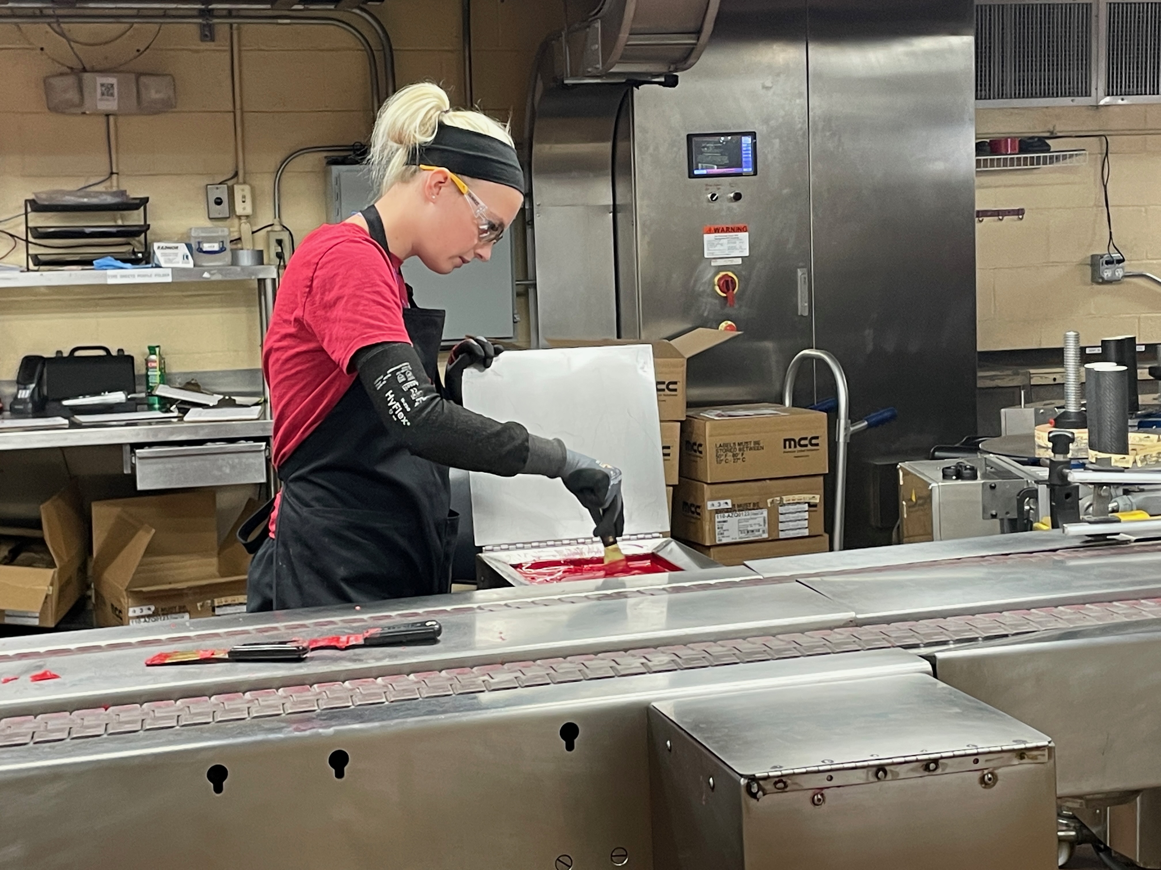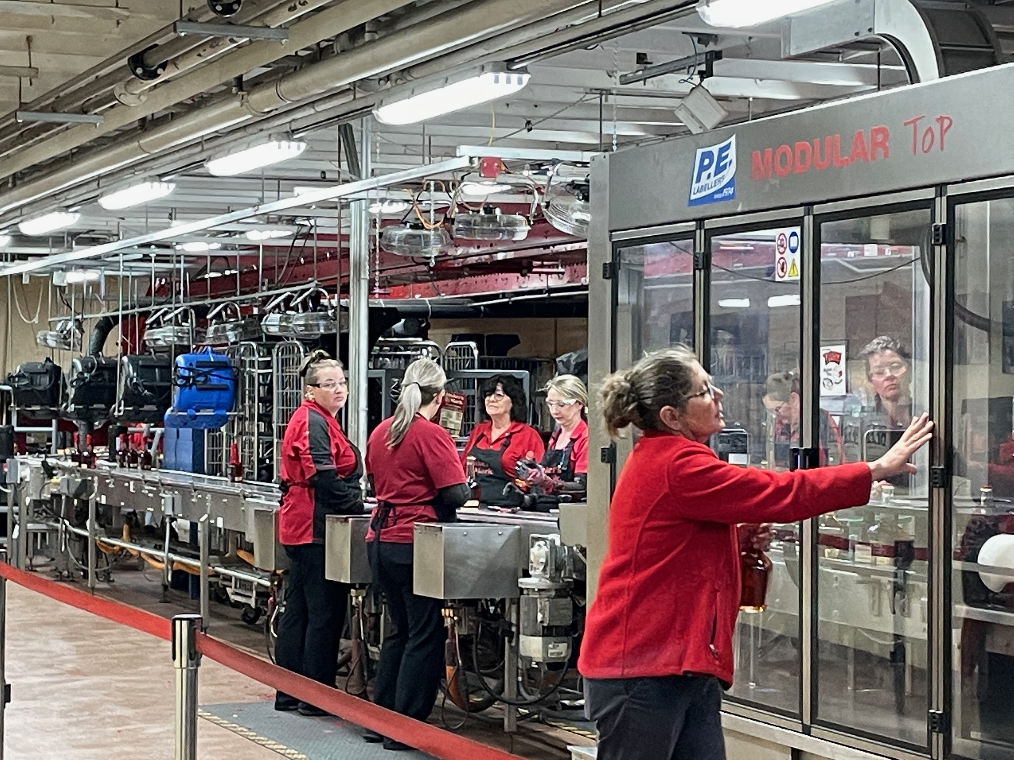 Just before our tasting, we entered the bottling room, a modern facility where the company’s uniquely shaped containers are filled, and they are hand dipped in that well known red wax. Unfortunately, just as we entered, the line went down and after crew members spent many minutes trying to get it started again, to no avail, we departed for our long-awaited tasting.