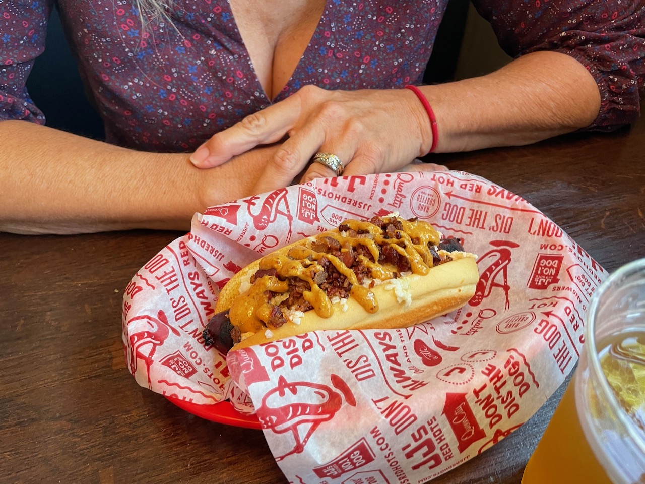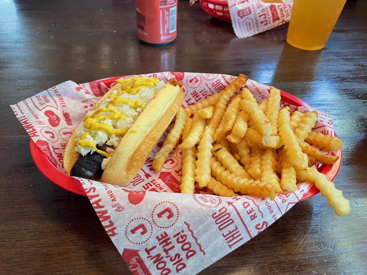 I landed in Charlotte around noon for what would be almost a week of catching up with our many friends and former neighbors there. Joanna picked me up at the airport and our first order of business was lunch, as we’d be consuming mass quantities of vino, as it our usual order of business our first night in town, at the Wine Vault in University City. Nothing prepares one better for a night of alcoholic consumption than a heavy dose of high fat protein, thus we made a beeline for JJ’s Red Hots on East Blvd which conveniently lay enroute to the Airbnb we’d rented for the duration of our stay. Joanna and I almost always get the same two dogs here, each starting with a Sahlen’s Pork and Beef Frankfurter.