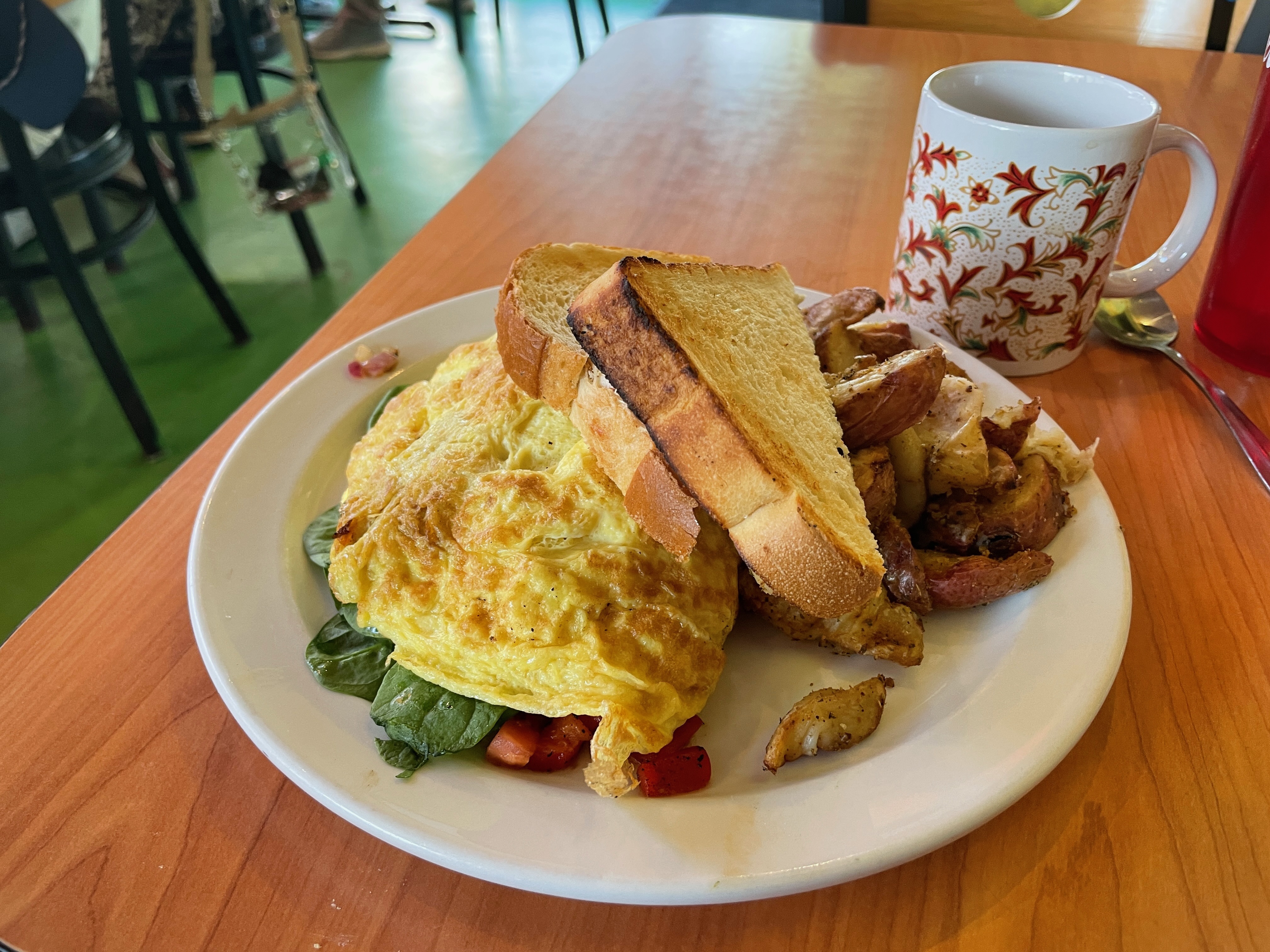 I had most of the day on Saturday to kill before meeting up with Hans later in the afternoon so decided to walk over to Zada Jane’s for breakfast. We’d eaten here a few times during out tenure as residents and I recalled that the offerings leaned to the healthy side of the spectrum. I ordered my usual breakfast choice, a veggie omelet (spinach, onion, red pepper, Swiss cheese and tomato) with roasted potatoes and whole wheat toast.