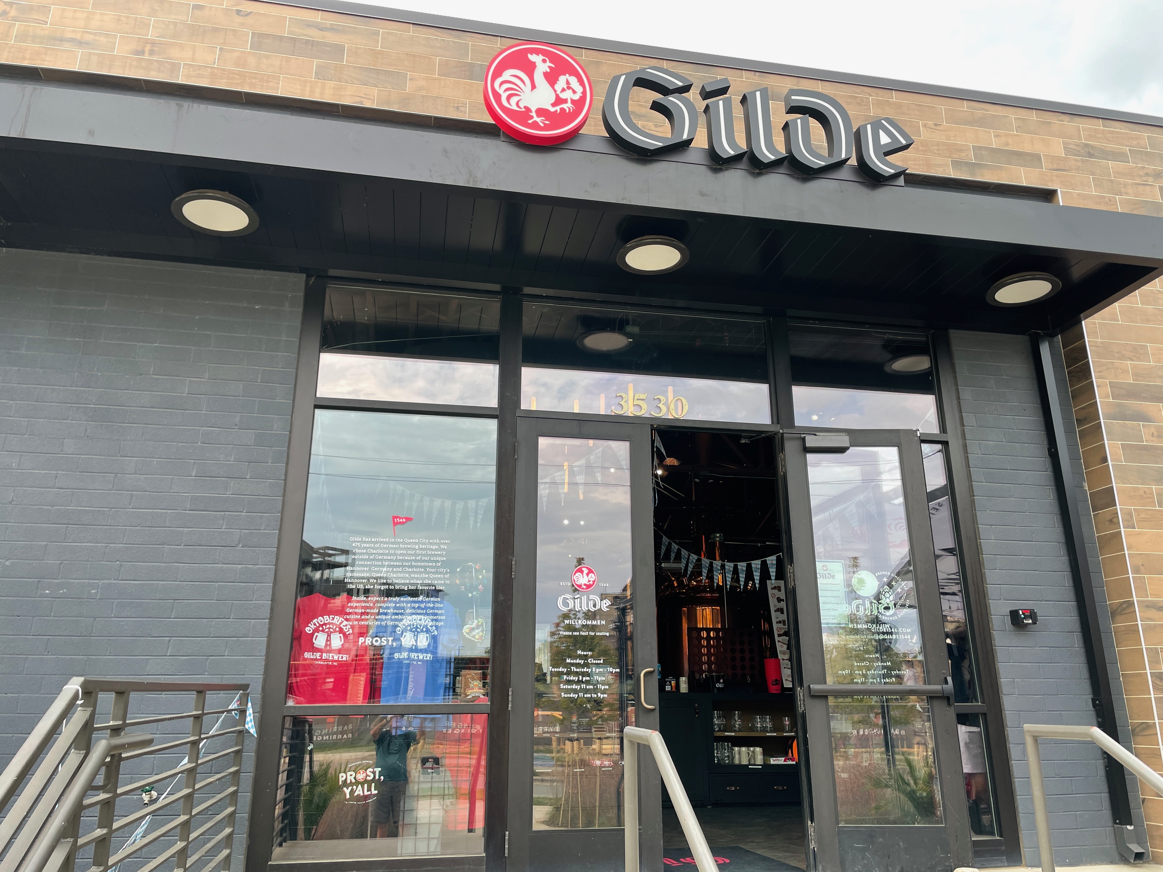 We enjoyed conversation with a local friend of Lyndsay and Dave’s and then, having finished our beers, took off to south Charlotte for Gilde, one of the town’s newest breweries. Opened in early 2022, this 9,500 square foot brewery and restaurant features authentic German architectural details, design touches, and millwork, all centered around the German-made brewhouse. Established in 1546 in Hannover, Germany, Gilde is one of the oldest breweries in Germany.