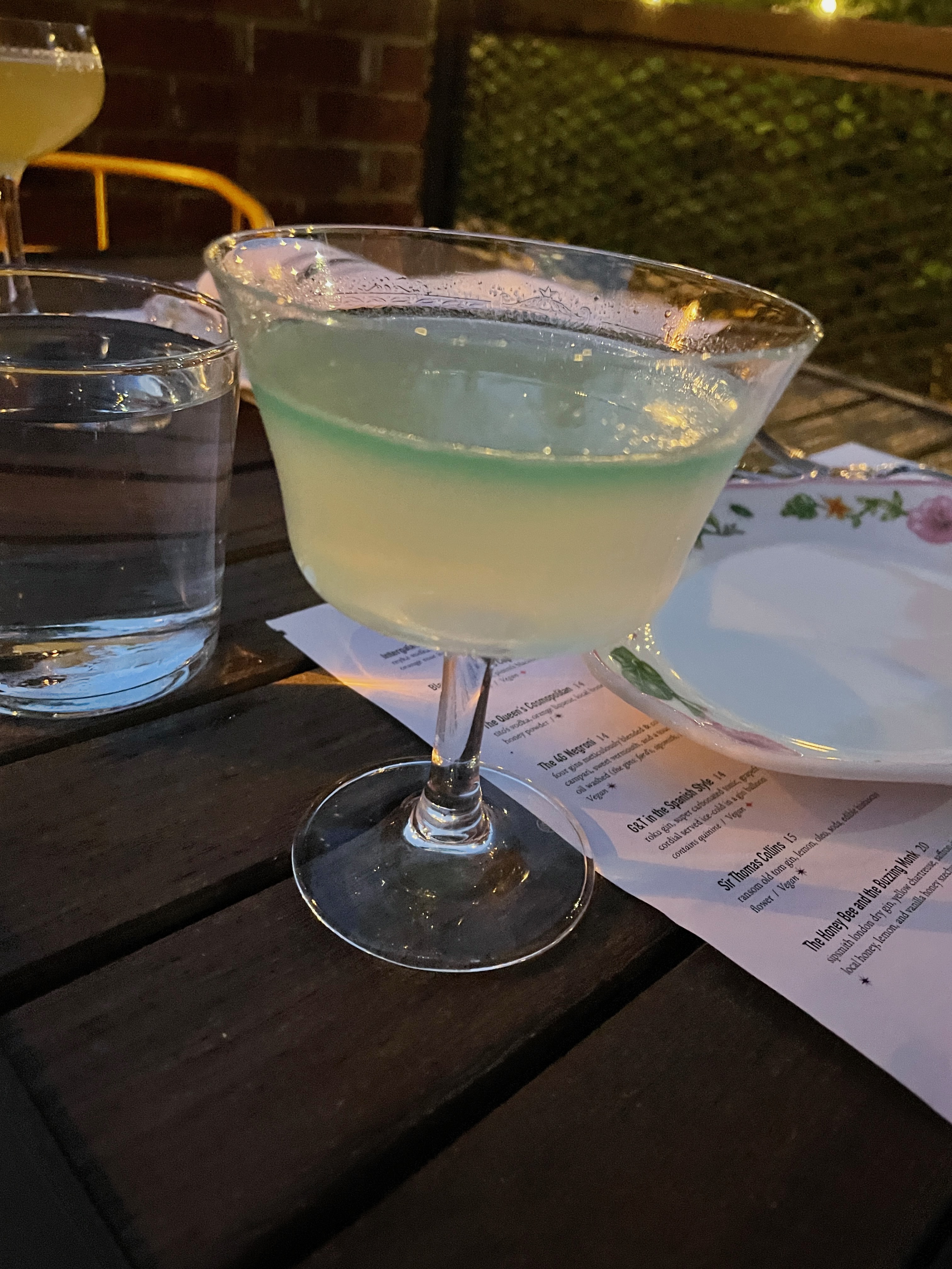 We bypassed the main dining room in the Sanctuary, the larger of the two buildings on the property and made a beeline for the bar in a smaller building. There, I ordered the Black Widow Manhattan (widow jane 10yr bourbon, widow jane applewood rye, and averna amaro) and Joanna soothed her cravings for mezcal by getting the Maybe Tomorrow (ilegal joven mezcal & el jimador blanco tequila sour with lemon oleo saccharum, lemon juice, sugar, and an herbaceous hint from absinthe & yellow chartreuse).