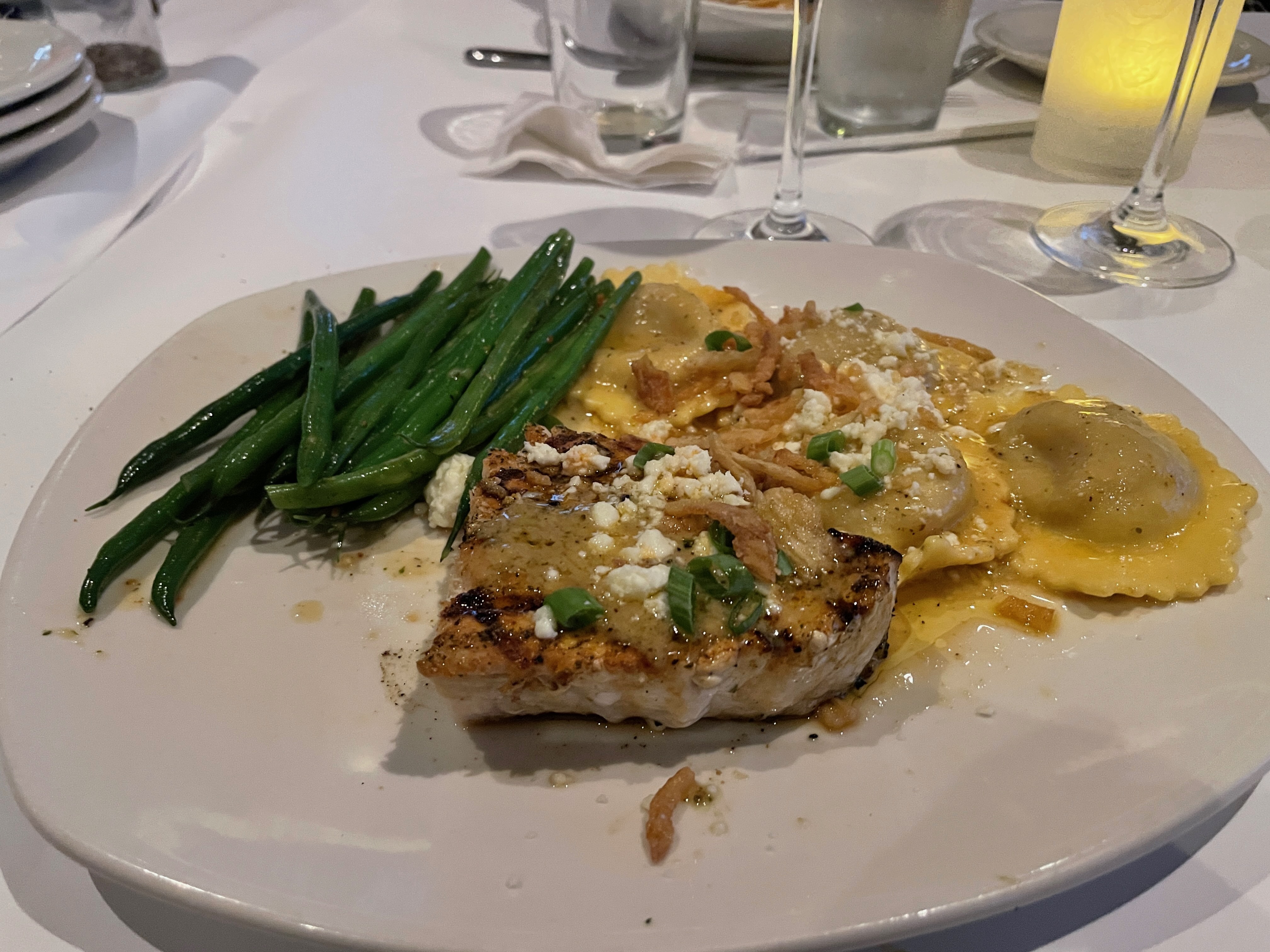 Arriving early, we sat at the bar and ordered a couple of glasses of house wine and once everyone arrived, were seated at our table for dinner. Joanna went big and ordered the Sea Bass, an expensive option but worth it for the quality of the fish while I opted for Swordfish with Pumpkin Ravioli. While we ate the conversation flowed with the primary topic being whether we might all convene again in the spring for the Cycle North Carolina Coastal Ride, a weekend long event that occurs in one of three coastal towns each April. It was agreed we would all try to do so, and we began thinking about a two-month road trip that would include the event.