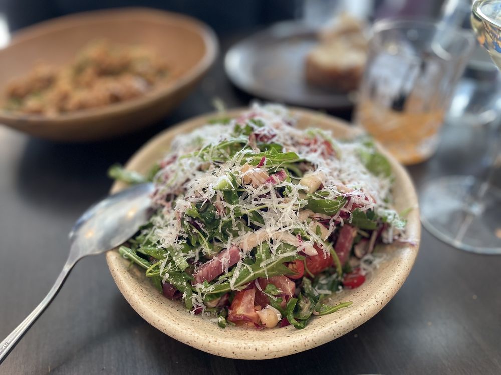 Along with the drinks we ordered the bread service, which includes a small loaf of their in-house sourdough bread, butter and an olive oil based dipping sauce This was a great start that then led us to our to be shared main courses, the Chopped Salad, Rigatoni Carbonara (egg yolk + house-made guanciale + peas), a Chicken Parm Sando (pomodoro sauce + provolone + basil + simple salad + chips) and The Brunch Pizza (lamb merguez + pomodoro + chorizo + fontina + quail eggs).