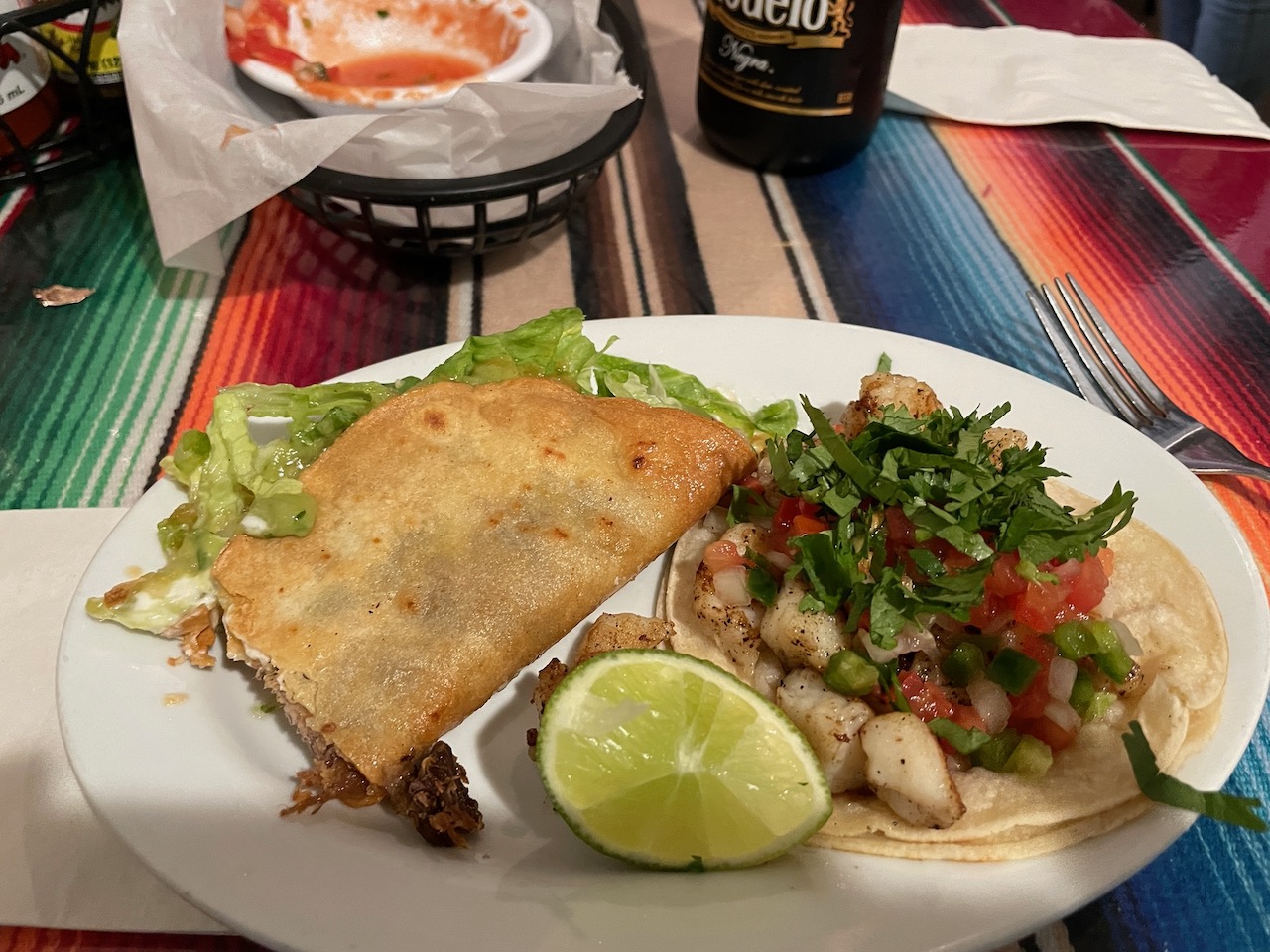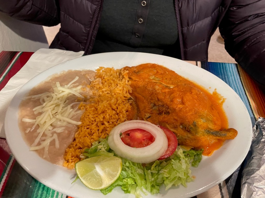 It’s a small unassuming place with limited seating, relying as we would soon find out on a high volume of take-out orders. And once we’d ordered, the Chili Relleno plate for Joanna and two tacos, one fried beef and one fish, for me and a beer apiece for us, we found out why. The food was fresh, the beans tasty (these and a relleno are how I rank restaurants of this ilk) and moderately priced to boot. We settled our tab at $40 including the tip and left as satisfied as one could be when stumbling upon a good dining choice.