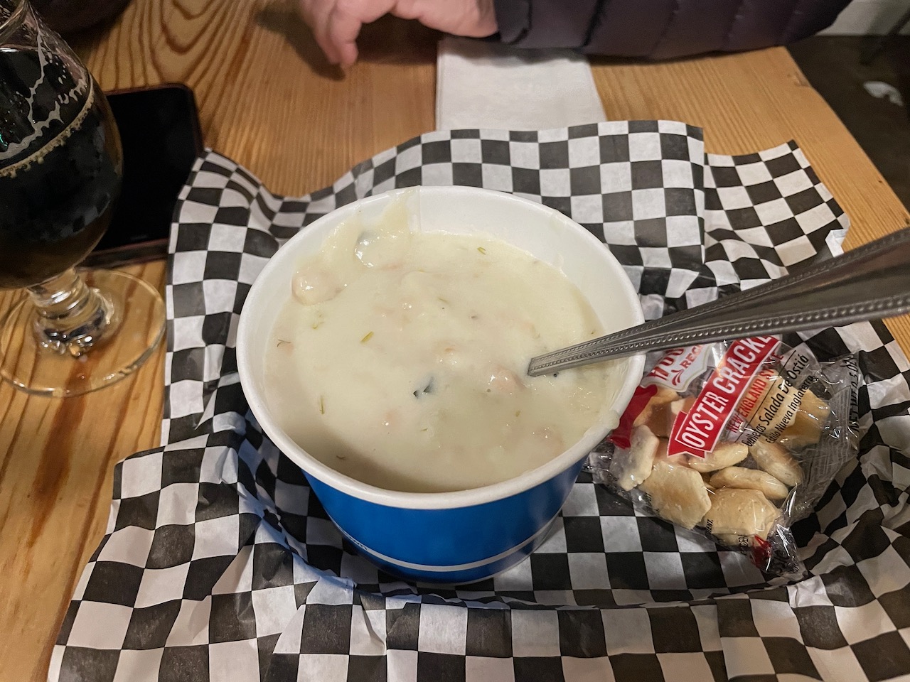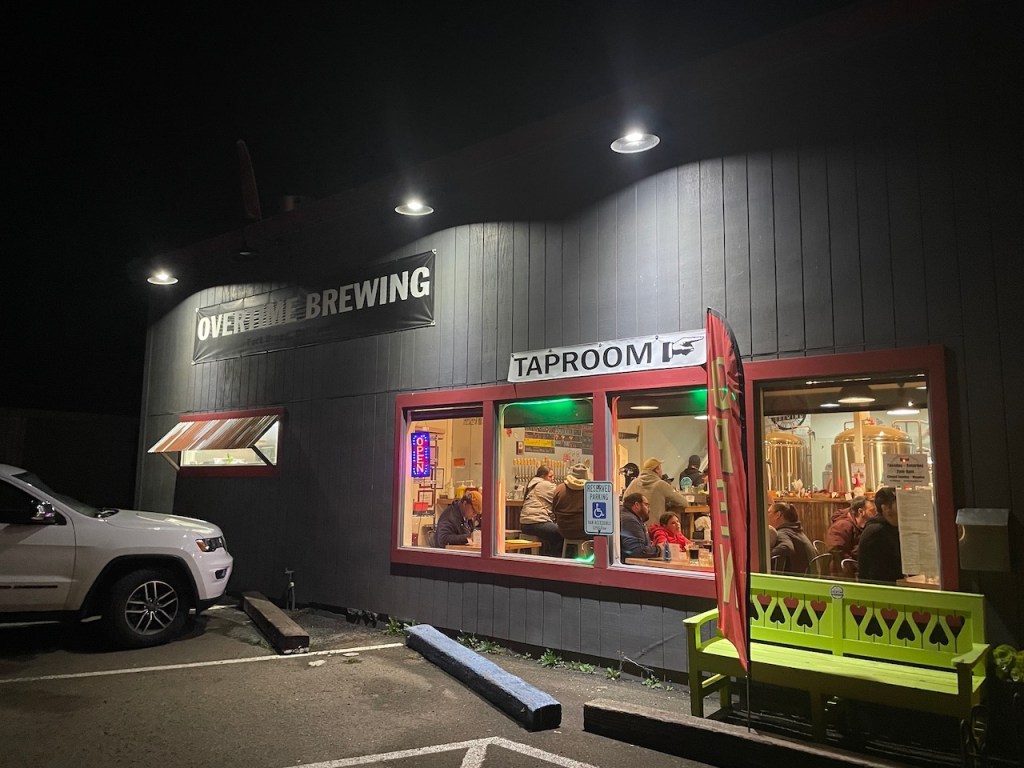 Finished with the movie and looking for a light snack, we dropped in at Overtime Brewing for a couple of beers and yes, you guessed it, a bowl of their clam chowder. Joanna enjoyed the Overkill Stout while I savored the Double Time Imperial IPA, both excellent compliments to the chowder, which we liked but found to be potato heavy and somewhat lacking in clams. Not a bad chowder, just not great.
