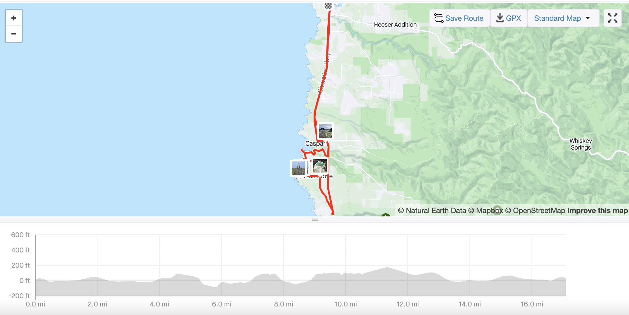 I spent some time inside the museum (which would be damaged soon thereafter by high waves that would leave two feet of water inside) and set off for Mendocino. I was riding on a road parallel to Highway 1 that ended at the entrance to Russian Gulch State Park, where we have camped many times, and I decided to cross the highway and return to Fort Bragg from there. The ride was going splendidly until I got about two miles south of town and felt that ominous squishiness coming from the rear tire and soon realized I had a flat. A pain to be sure but fixable and doing so, I got back to the Emerald Dolphin not long before Joanna returned from her horse-riding session.