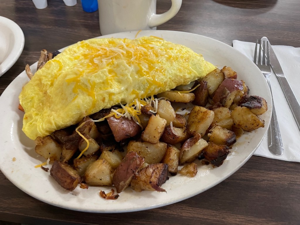The next morning, to prepare for our planned fun event, that is riding on the famous Skunk Railroad where we would meet up with longtime friends Mary and Norm, we walked across the street from the Emerald Dolphin to enjoy a hearty breakfast at David’s. It’s locally owned and was busy when we arrived, always a good sign. Joanna opted for a half order of the Roundman’s Corned Beef Hash while I got my usual seasonal veggie omelet. I selected the seasoned red potatoes to accompany it and the whole meal was excellent, particularly at the very reasonable prices they charge, less than ten apiece for each of our entrees.