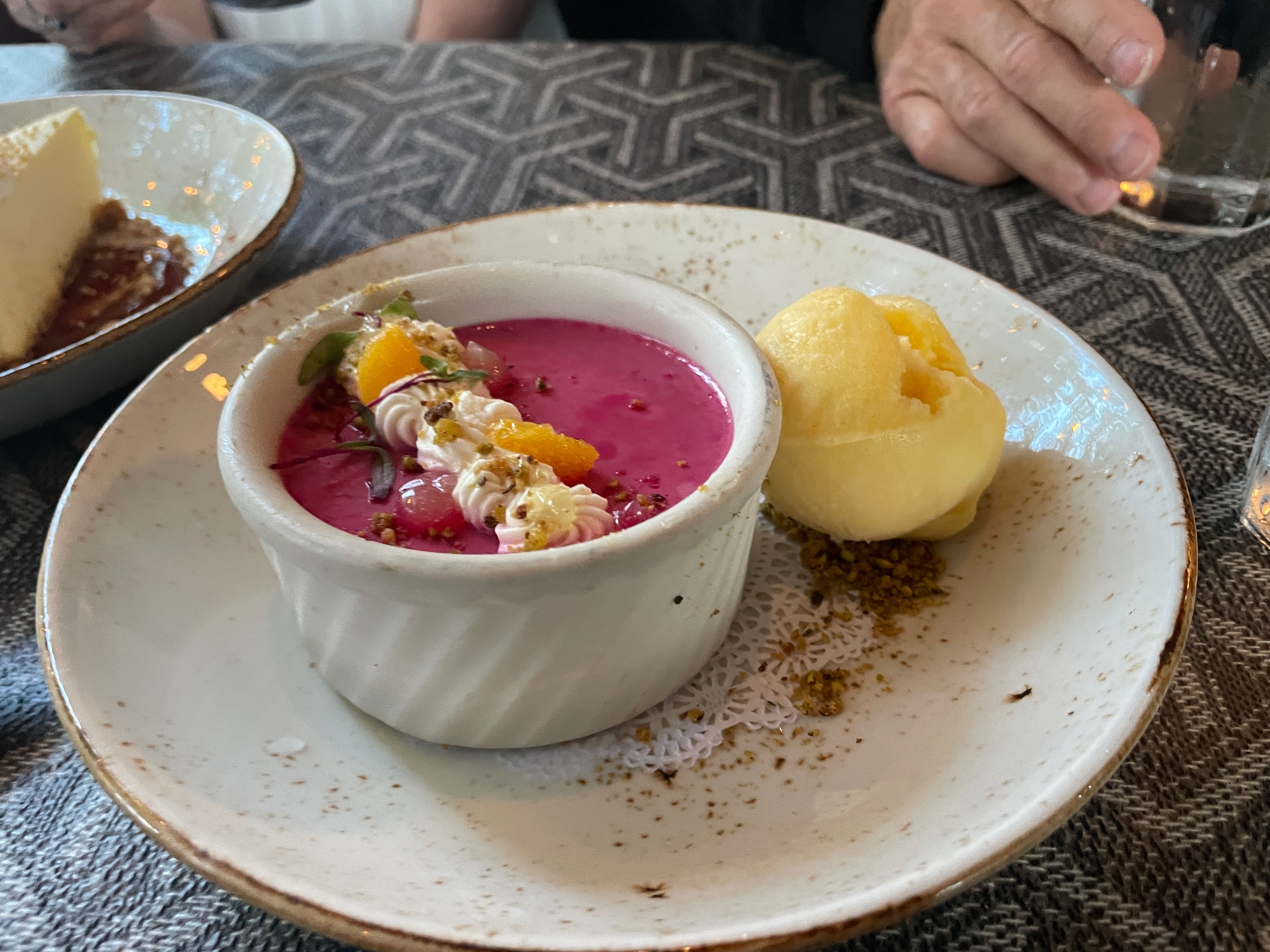 While it was all as good as usual, the highlight of the meal was a dessert special that night, a red beet mousse that was so unexpectedly good that we savored every bite, succulently rich in mouth feel, just the right amount of sweetness leaving one amazed that the basis for the creation was the humble beet.