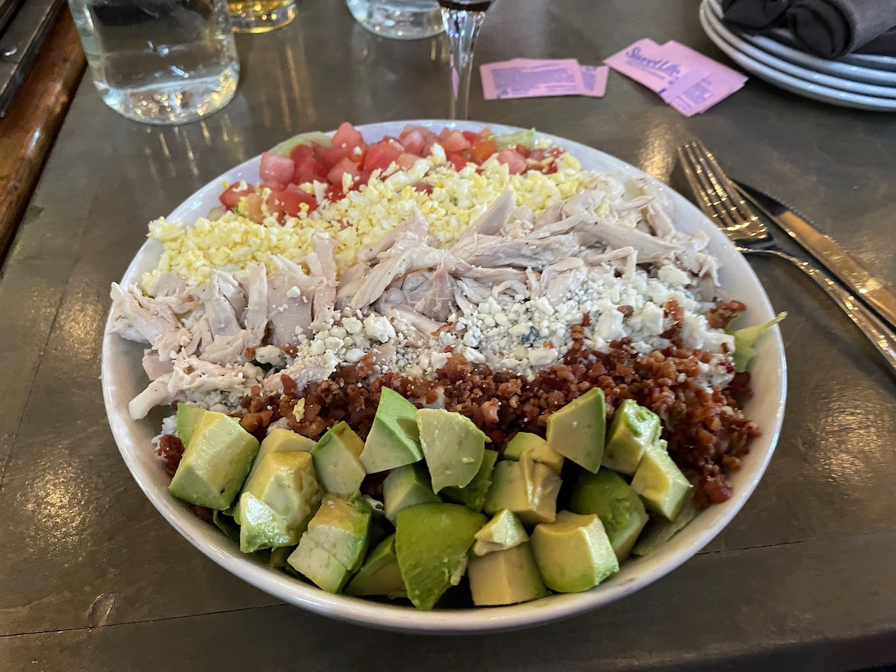 It’s larger than it first appears, and our large party was seated promptly, Joanna and I sitting across from each other in the middle of the table so we could carry on a conversation with multiple people. She ordered the Burnt Ends Plate (BBQ burnt ends, baked beans, and slaw) and I had the Chicken Cobb Salad (Chopped lettuce, eggs, rotisserie chicken, bacon, avocado, tomato, blue cheese, creole vinaigrette, and crispy corn nuggets), both good sized portions with quality ingredients. It was enough to hold us until the next morning when a good breakfast at the house got us on our way to the airport and our flight home, another fun and rewarding trip to North Carolina in the books.