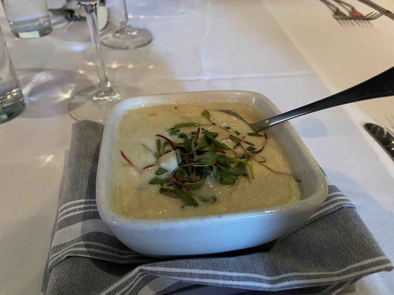 First, the service was inconsistent, taking much longer than it should have for some of the courses to appear, like the corn chowder (my third of the trip, did you notice?) I ordered to start, which didn’t appear until almost thirty minutes after we were seated.