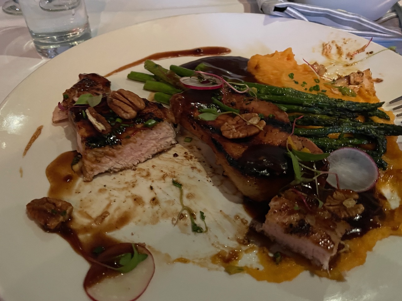 For entrees Joanna ordered the salmon, which came in a teriyaki glaze with some lump crab, quite delicious while I opted for a pork chop, also with a glaze which while tasty, was a bit overcooked and not nearly as tender and moist as it could have been. In the end, it all didn’t matter as we were with two lifelong friends and, best of all, it was half price glasses of wine night. That will make any meal a winner.