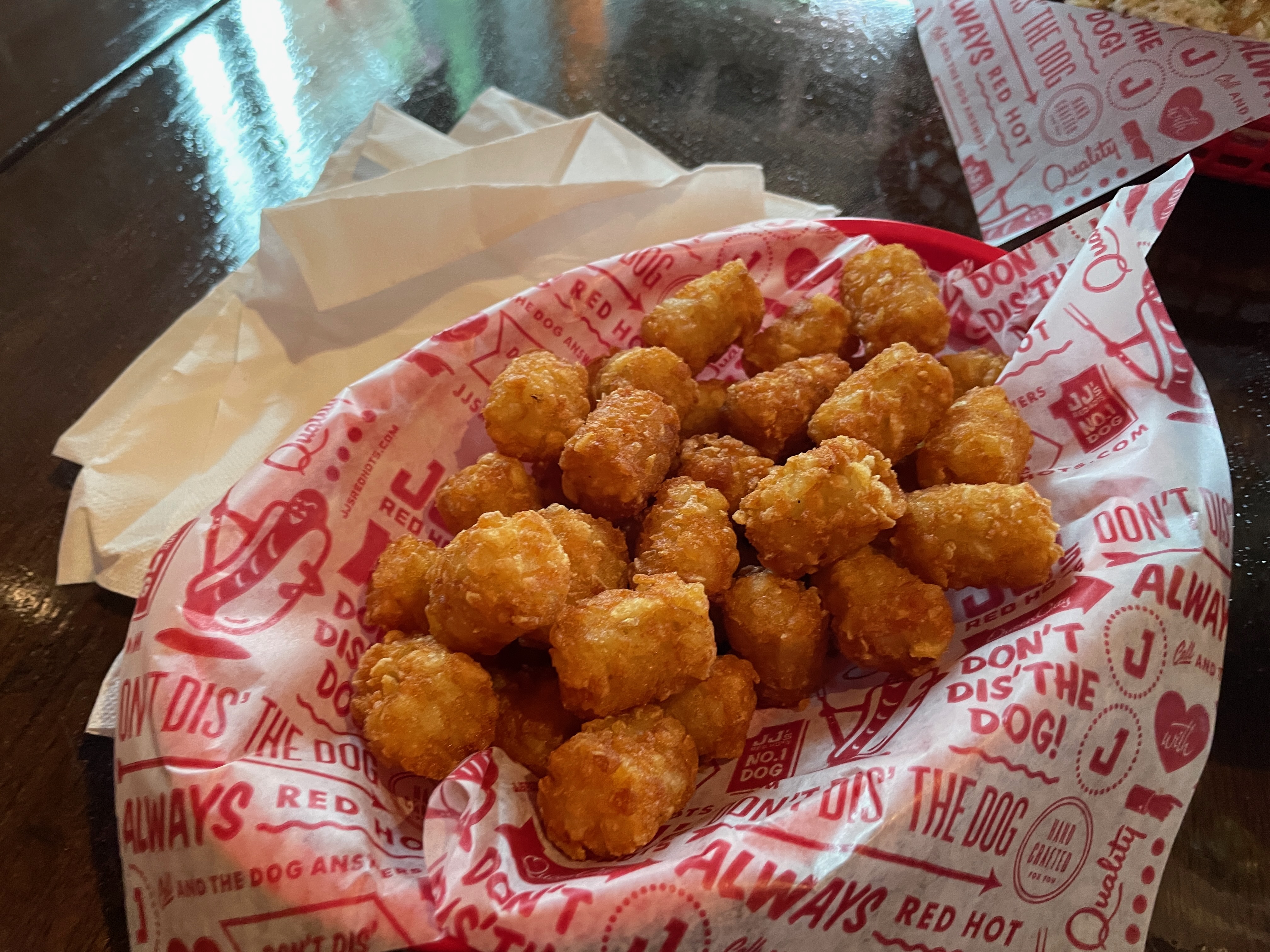 The next day we set out for Charlotte for the rest of our stay, splitting our time between staying with Diana and Jim and Dianne and Loren in Kannapolis. As with so many of our past visits, this one would revolve around meeting up with our many friends in town and hitting as many of our favorite restaurants as we could fit in, starting with JJ’s Red Hots, where I enjoyed my usual Char Heel (House-made Chili, Slaw, Diced Onions, and Yellow Mustard) and for Joanna, the Southern Girl (Pimento Cheese, JJ’s Slaw, Bacon, and Hot Blonde Mustard) both centered around a pork & beef blend Sahlen’s Smokehouse Hot Dog, while splitting a basket of very good tots.