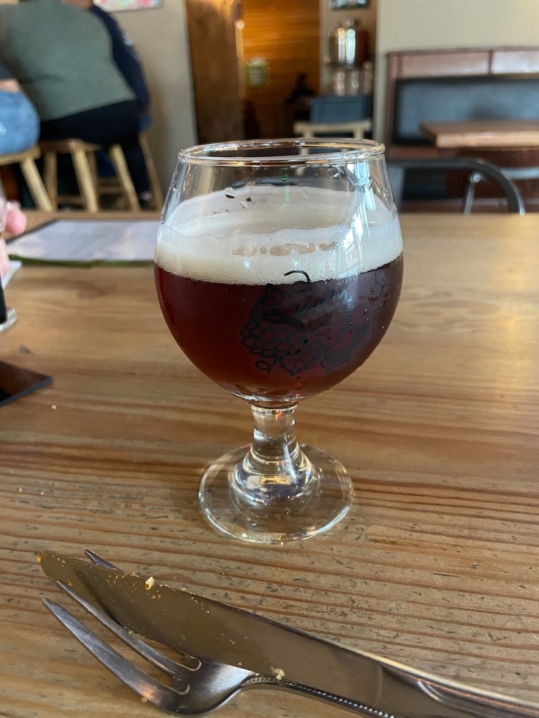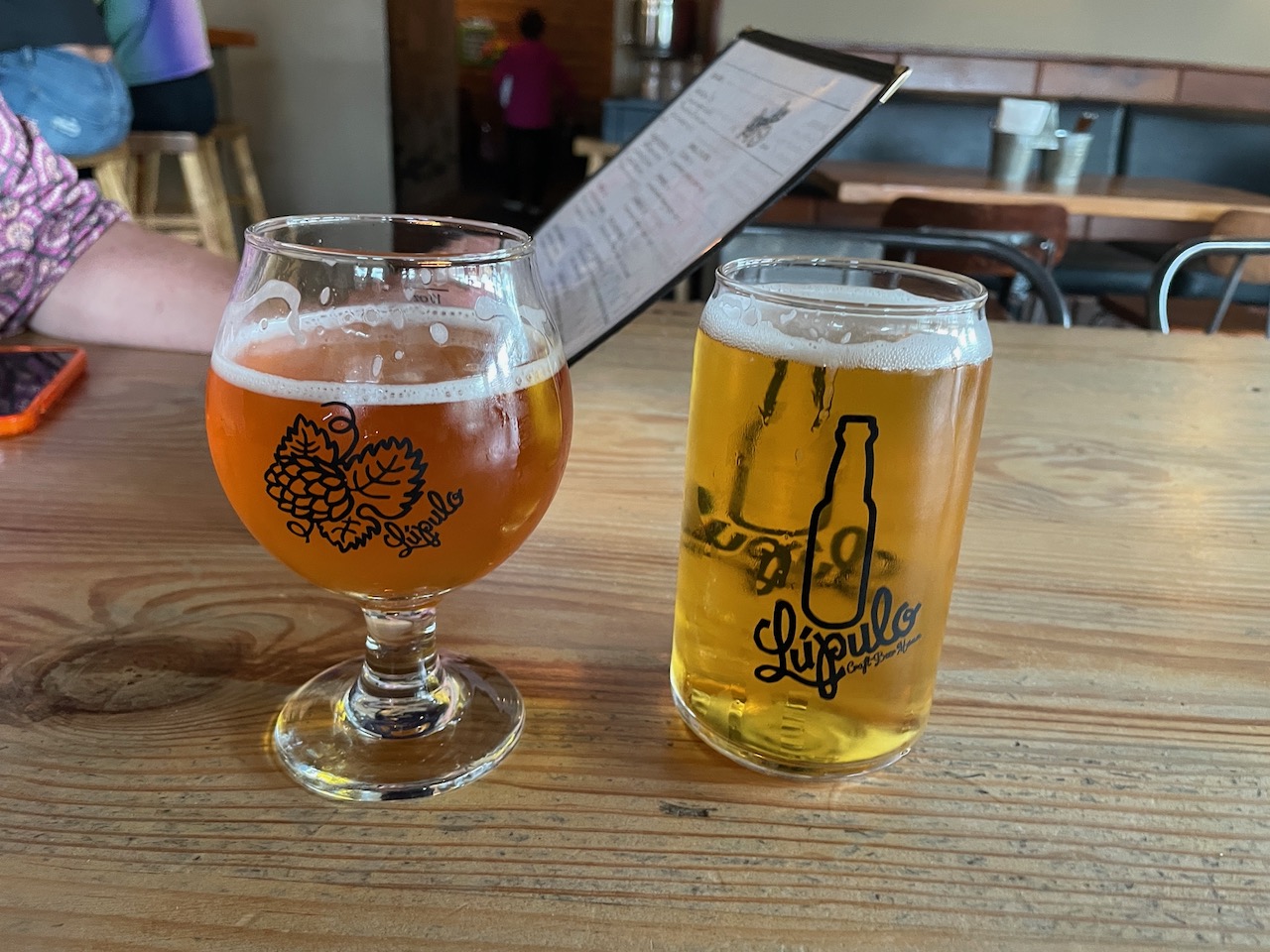 Our location in town on Ocean Street ended up being a good one, not necessarily close to the beach and pier, but with a good choice of dining options close by. We walked a half mile down Soquel Avenue and across the San Lorenzo River to our first choice (thanks again to Trip Advisor) the Lupolo Craft Beer House. Located in what appeared to be a thriving area of other eateries, we entered, checked out the tap list and ordered our first round, a Rhubarb Sour for Joanna and a Pliny the Elder for me.