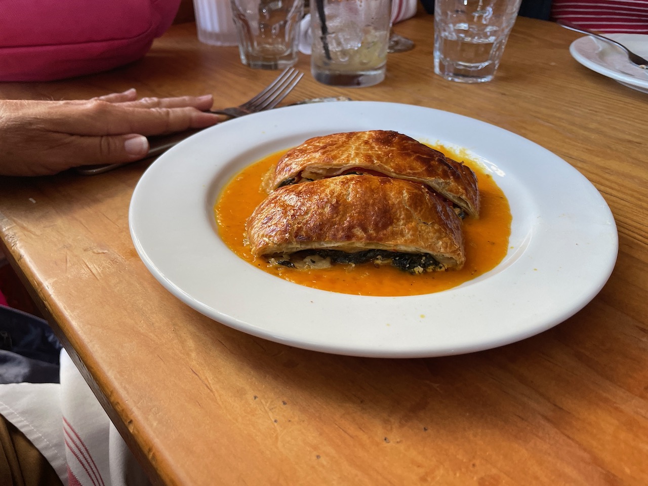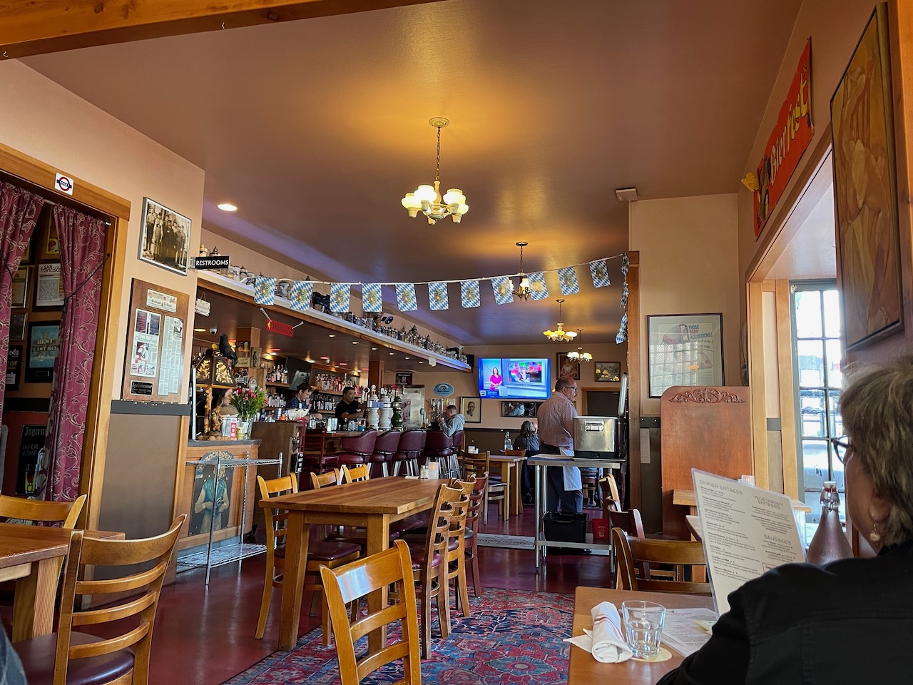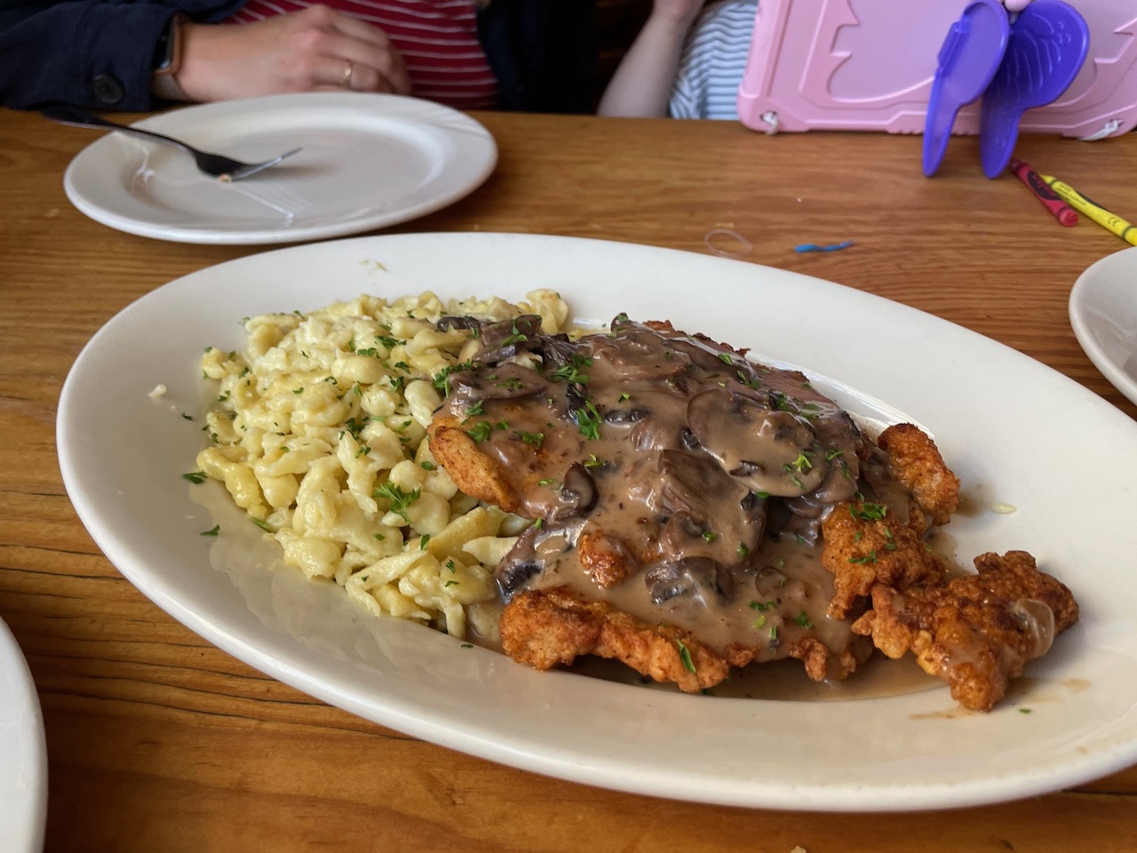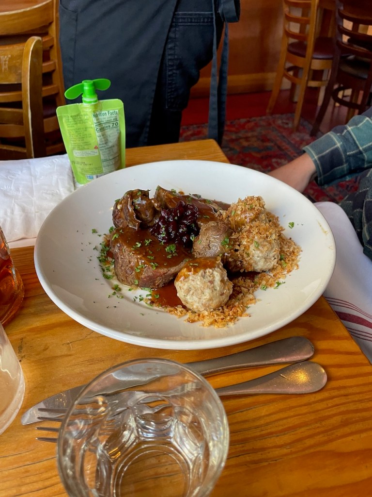 For entrees, Jessica ordered the Gemuse Strudel (Spinach, Goat Cheese and Red Bell Peppers wrapped in puff pastry served over Carrot Puree), Joanna a Crab Cake appetizer, Kris a roast meat special of the day with dumplings (we can’t remember what the meat was, but it was tender and delicious) and I went for my usual, the small order of the Jaegerschnitzel, served with their always good Spaetzle.