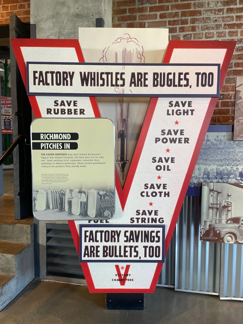 Although physically small, the center features a lot of well-crafted and informative permanent and temporary exhibits about the history of Richmond’s wartime industries and workers, information including a film about the home-front battle. In addition to Home Front workers, everyone was expected to be an active participant in the war effort. Rationing was a way of life as twenty commodities were rationed and people were asked to, “Use it up –Wear it out –Make it do –or Do without.”