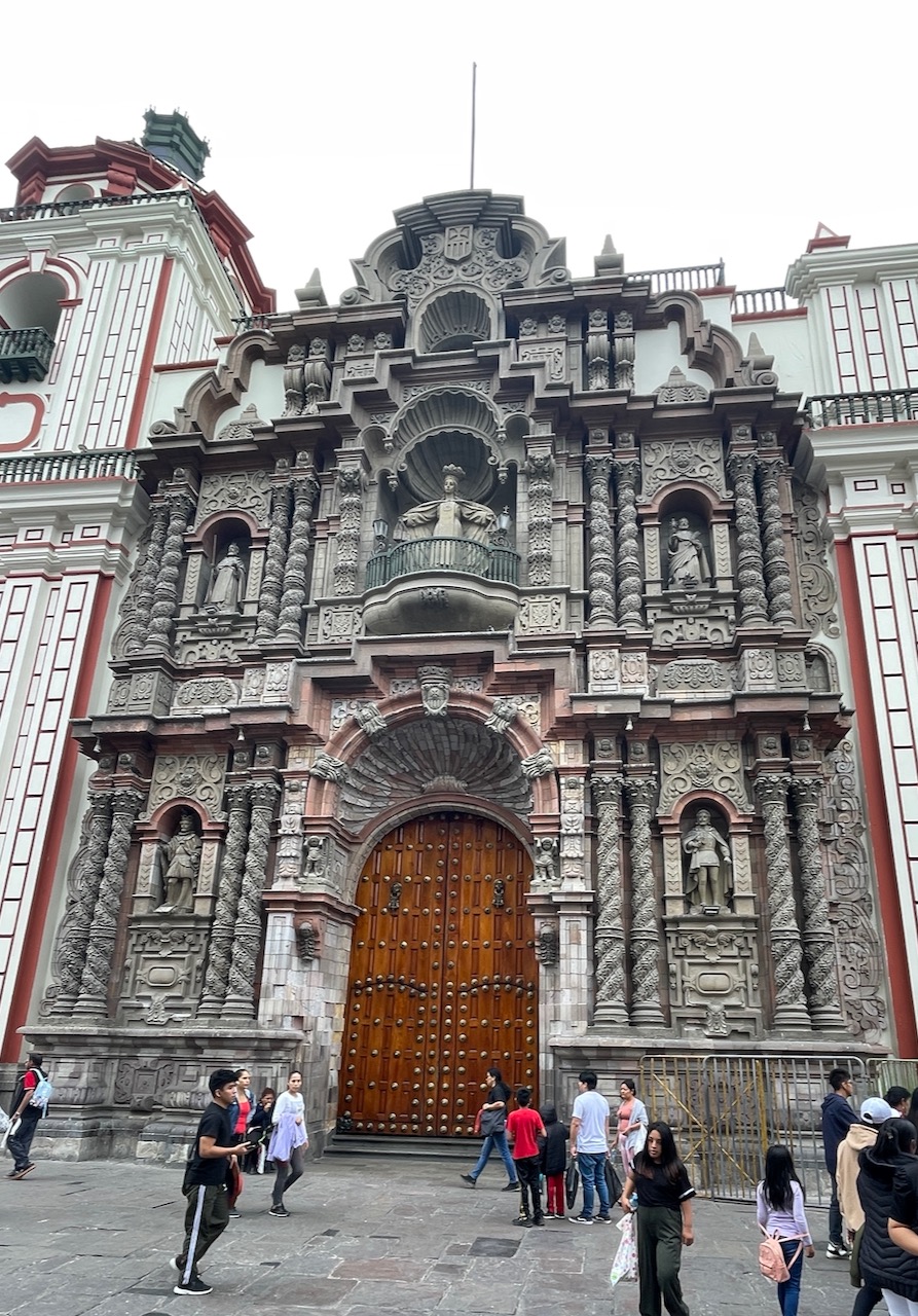 After the earthquake of 1746 the church was partially restored; its notable doorway is made of a special quality of original granite from Panama, which was brought as ballast, a stone used as a weight that was placed on the bottom of the ship, to favor its balance, by the galleons that came to load minerals in Callao. This fine doorway, artistically carved in three sections, was built using gray and pink stones, forming a combination that is not found in other Lima temples. Its only tower, begun in 1539, should have been higher but was lowered following the earthquake of October 20, 1687.