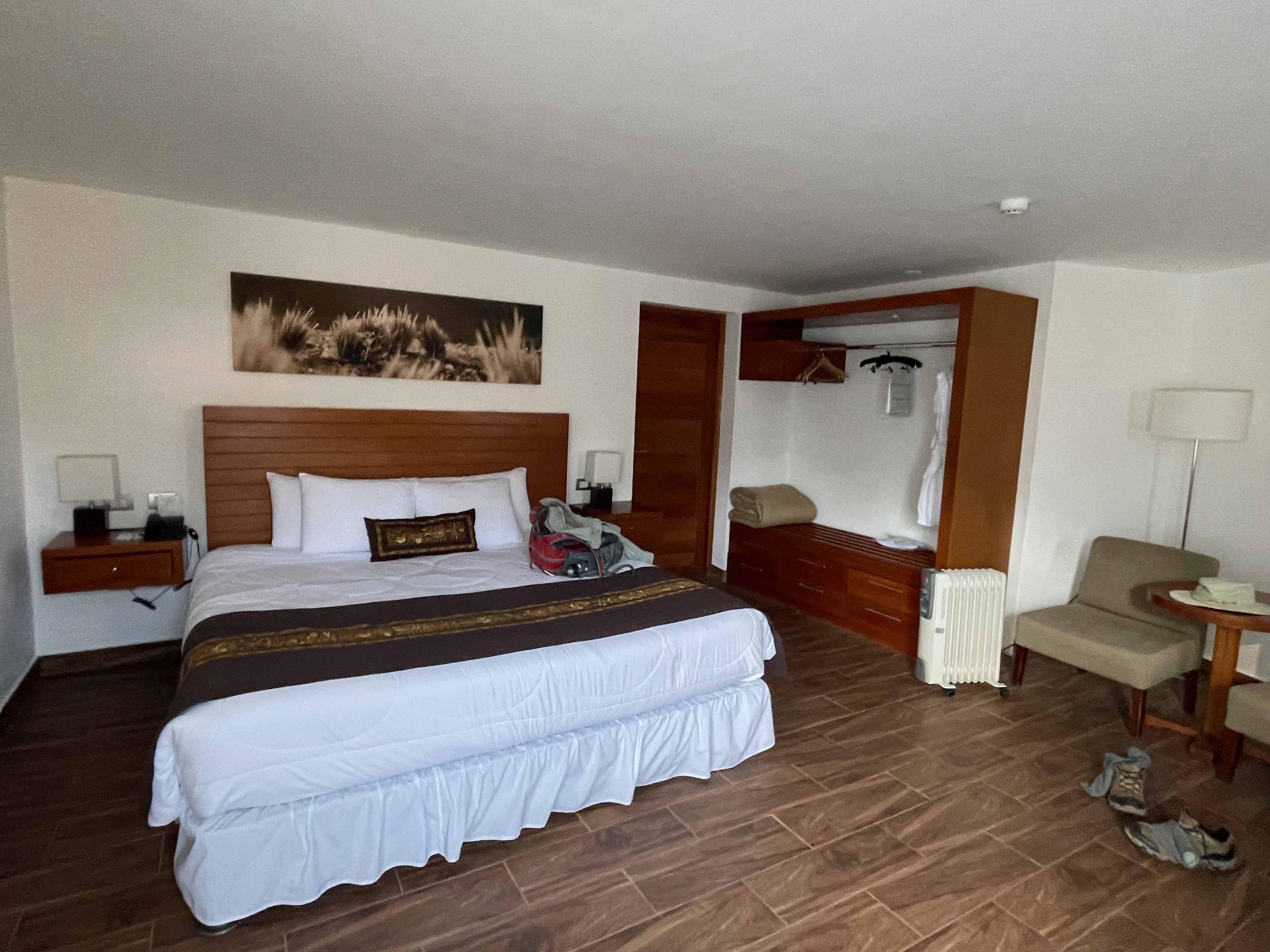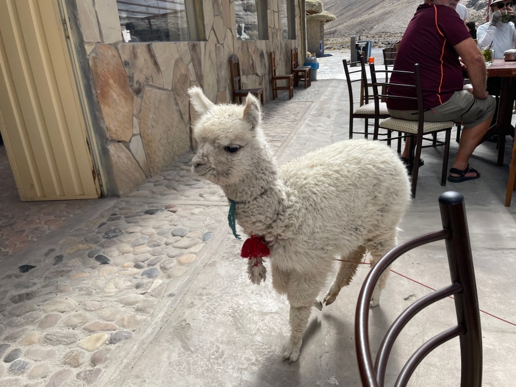 As the day was drawing to a close, we continued on a steep downhill to the Aranwa Pueblito Encantado del Colca Hotel, our lodging for the night. Located along the rugged Colca River, now quite dry due to a dam upstream, it’s a spectacular setting with tiered grounds coursing with small waterfalls that stream past the rooms, some of which are in separate bungalows and the others in blocks of four. Our room was large and well-appointed with a bathroom as large as our bedroom at home. We spent a quiet evening in the room, again not opting to eat dinner due to the altitude, but we would eat our fill the next day as we head to Puno and Lake Titicaca.