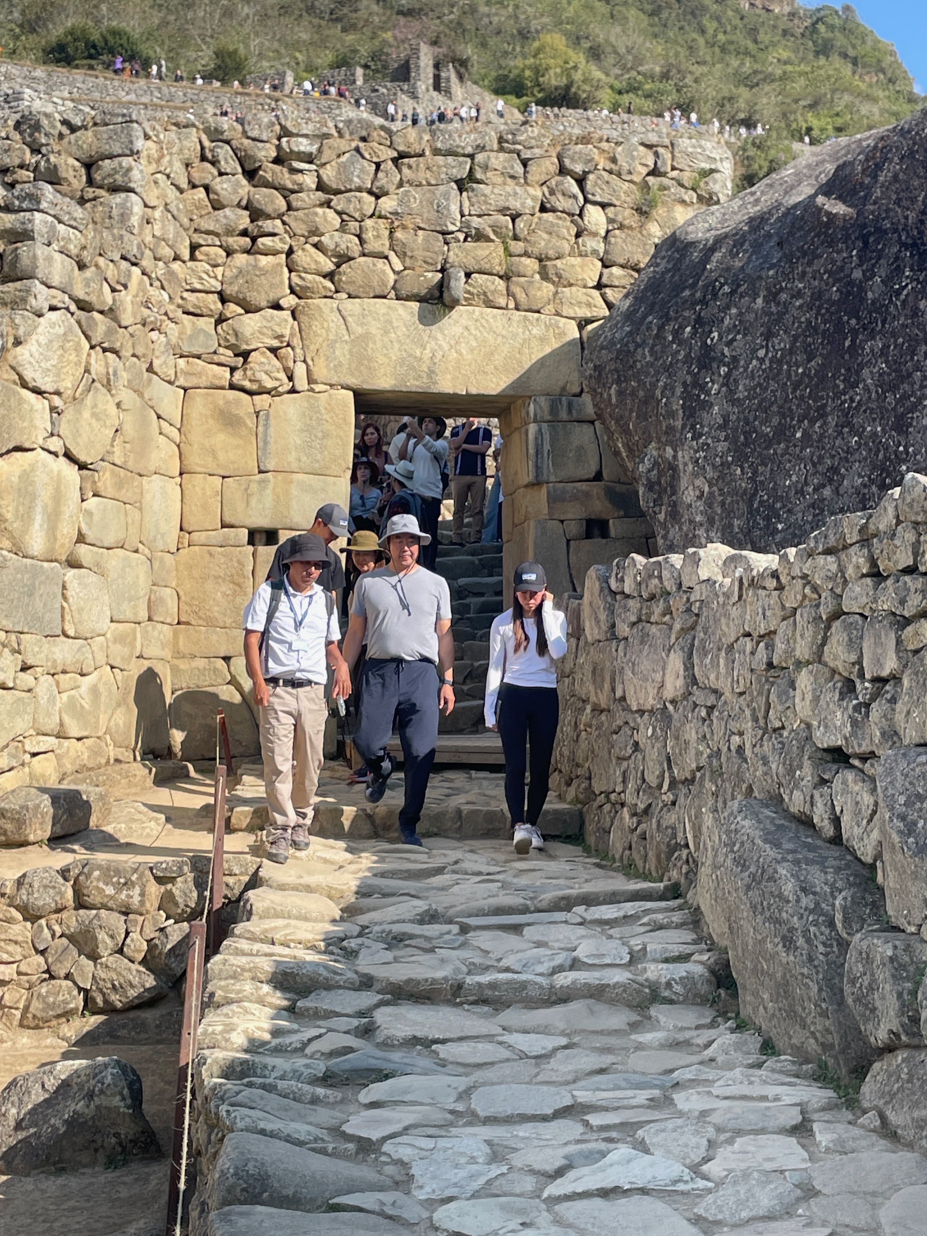 After reaching the summit of our climb, we began to descend to a large plateau, stopping to take a picture of each of us posed with Machu Picchu in the background. Then we sat down while Luis discussed his knowledge of the site, its construction and its possible use. The central buildings here use the classical Inca architectural style of polished dry-stone walls of regular shape. The Incas were masters of this technique, called ashlar, in which blocks of stone are cut to fit together tightly without mortar.