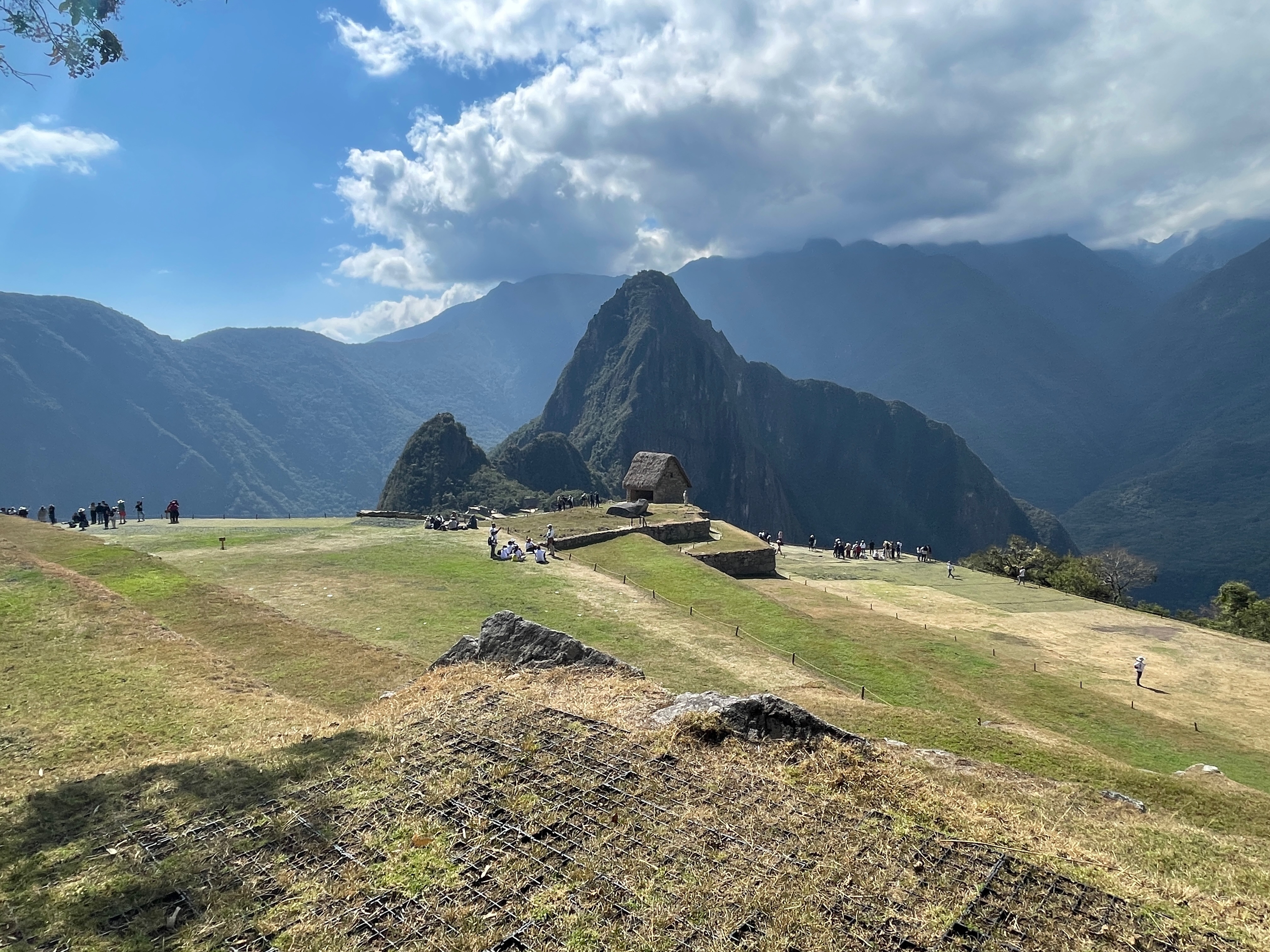 As we worked our way down to the main section of the site, we stopped at the Intihuatana stone, which is one of many ritual stones in South America. These stones are arranged to point directly at the Sun during the winter solstice. The Inca believed the stone held the Sun in its place along its annual path in the sky. At midday on 11 November and 30 January, the Sun is situated almost exactly above the pillar, casting no shadow. On 21 June, the stone casts the longest shadow on its southern side, and on 21 December a much shorter shadow on its northern side.