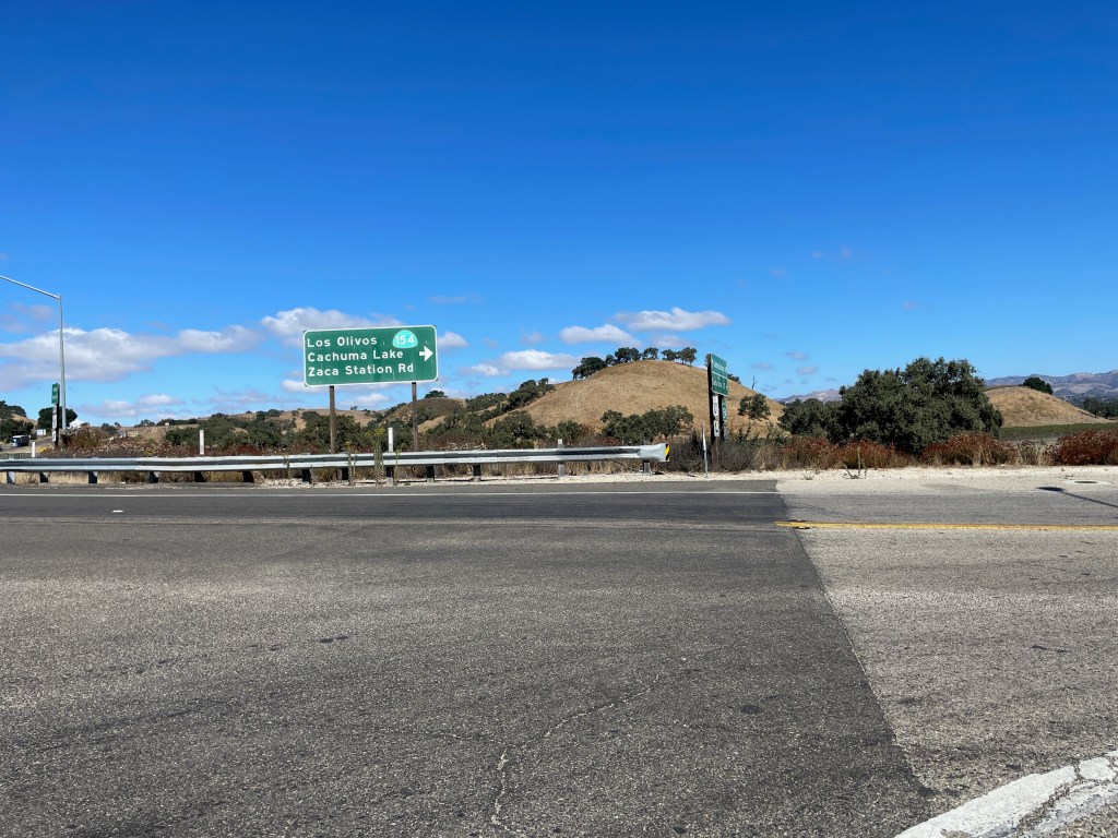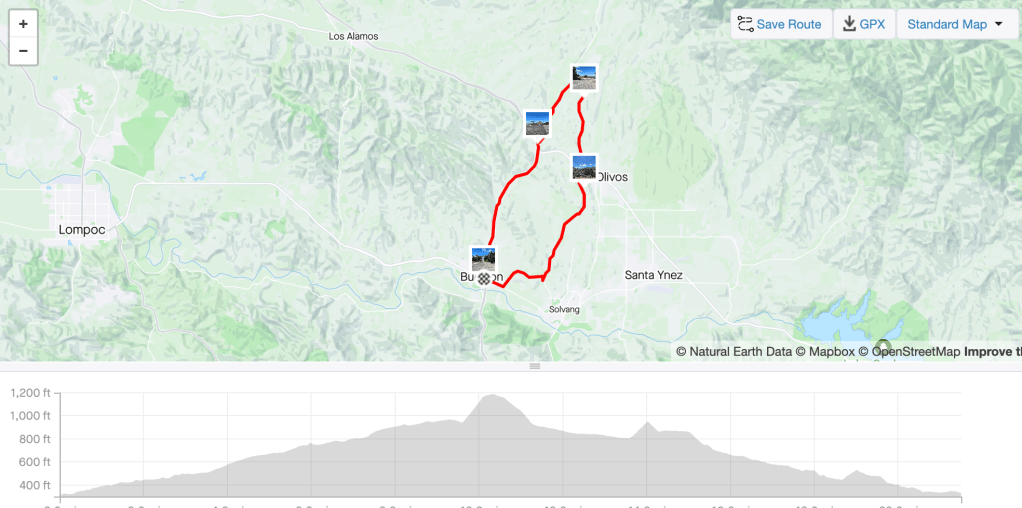 We got the bikes ready and then took off for a ride we’ve done a couple of times now, that is to head north out of Buellton until the road ends, cross over onto the 101 (very carefully) and then continue north to the offramp for Highway 154 where we make the turn onto Zaca Station Road for the bumpy ride (why does a county as seemingly well off and devoted to promoting tourism keep its roads in such crappy condition?) to Foxen Canyon.