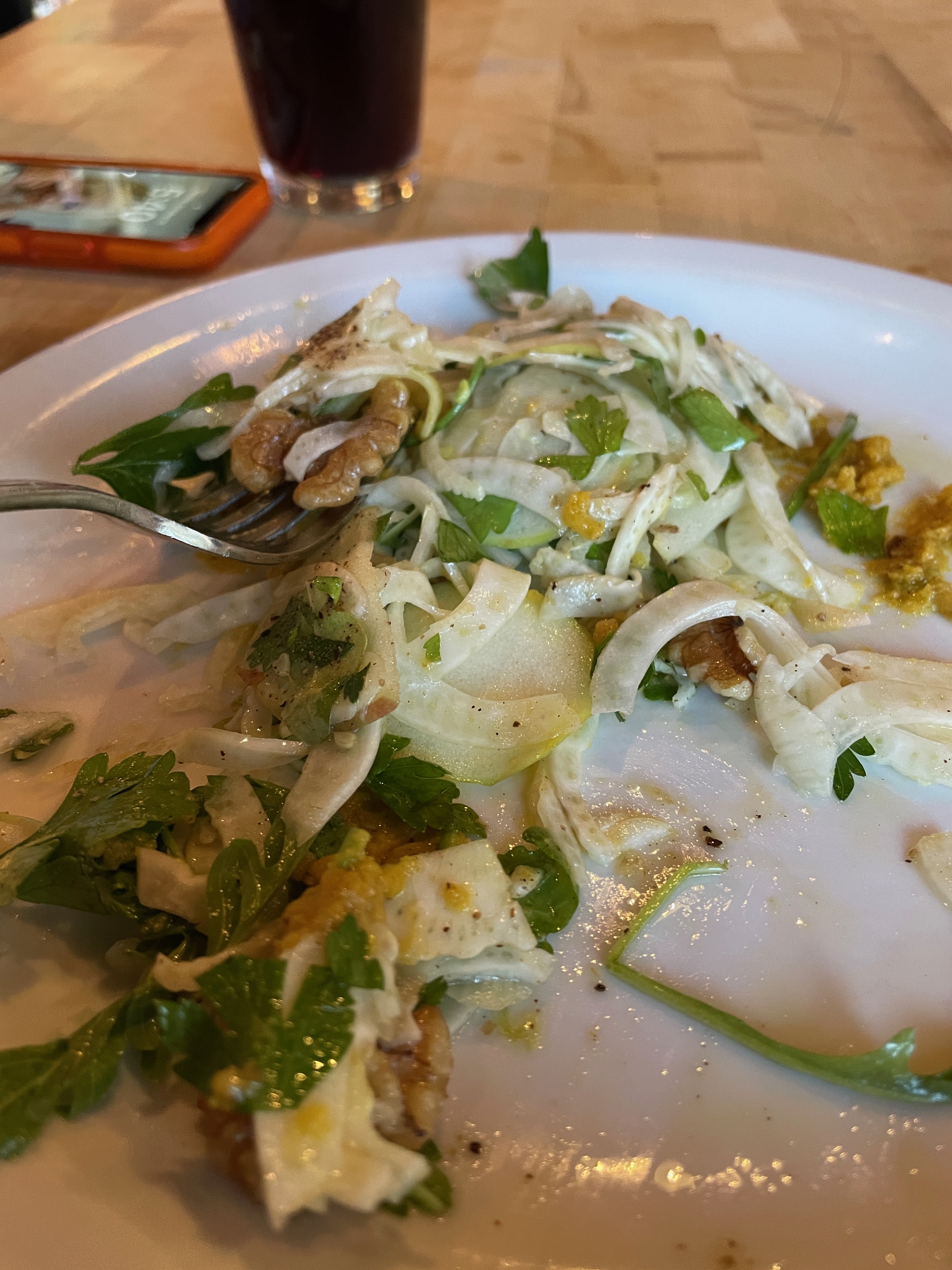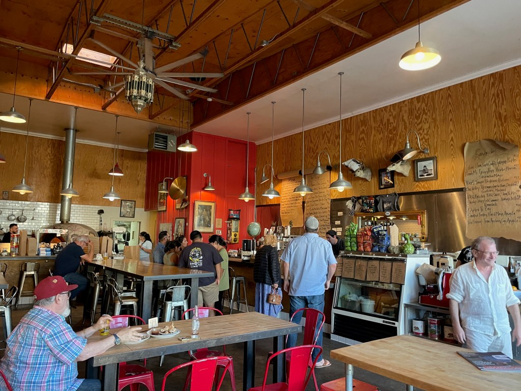 They’ve built a nice outdoor setting for tasting and we spent about an hour enjoying the samples we received, a couple of which were in our allotment to take with us. Finished, we drove back to Buellton for dinner at Industrial Eats, where we’d enjoyed a good meal with our cycle buddies during a multi-day stay here a couple of years ago. We’d duplicate what we ordered the last time, that is a Shaved Fennel, Apple, Walnut, Parsley Salad and a Fennel Sausage, Tomato, Mozzarella, Basil Pizza. Besides being delicious, another compelling appeal to dining here is how reasonable the prices are compared to other restaurants in the area.