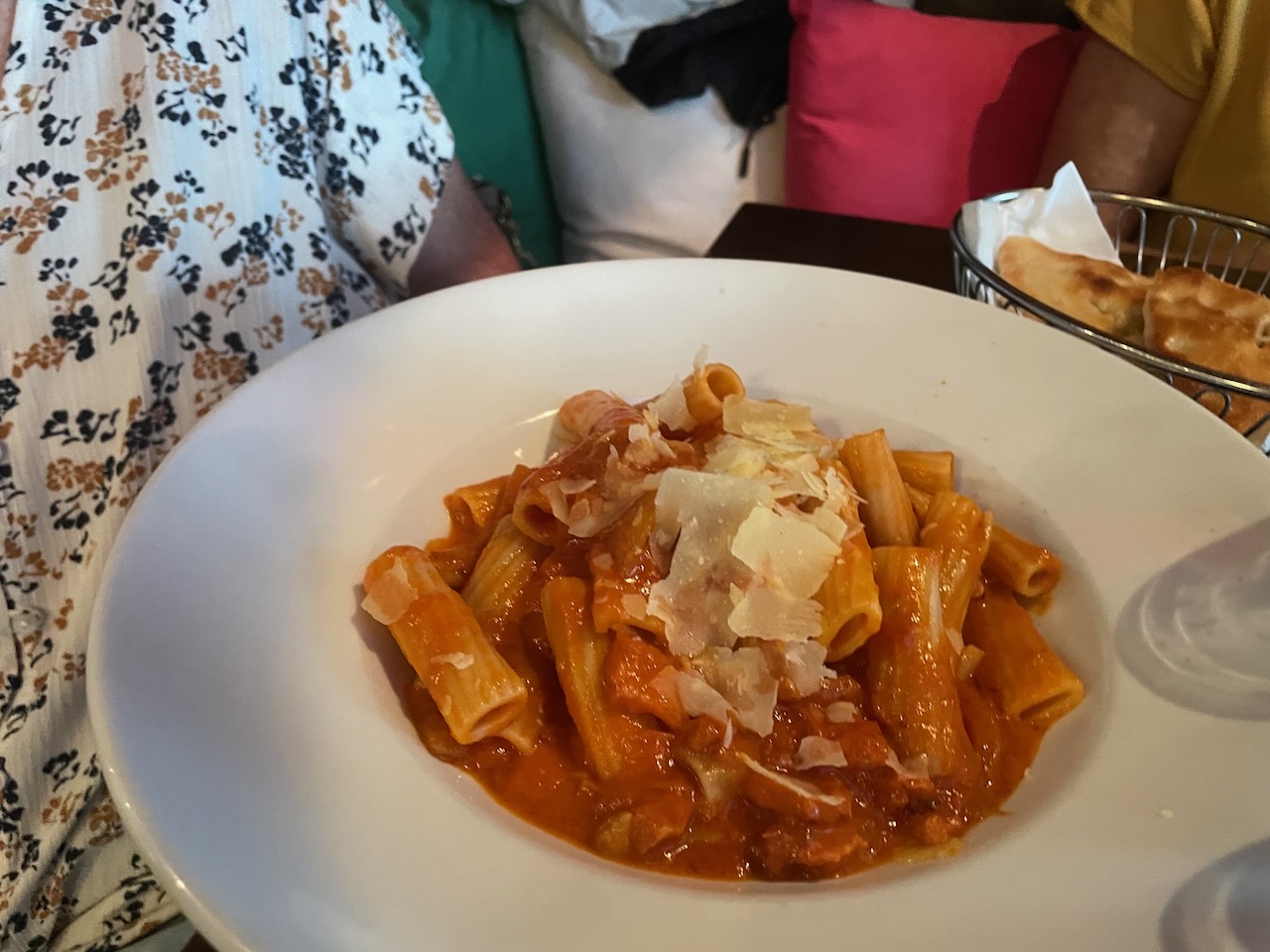 As usual we started with drinks, a glass of wine for me, a Sex on the Beach for Bev, and a Japanese Slipper (Midori, Cointreau & Lemon Juice) for Joanna along with two orders of their delightful, toasted bread. For entrees, Bev went with the Rigatoni Amarticia (bacon, onion & garlic pan fried in extra virgin olive oil with pomodoro sauce & Italian parsley), Joanna the Calamari, and for me the Scaloppine Marsala (white veal with sweet marsala sauce, served with seasonal vegetables & potato).