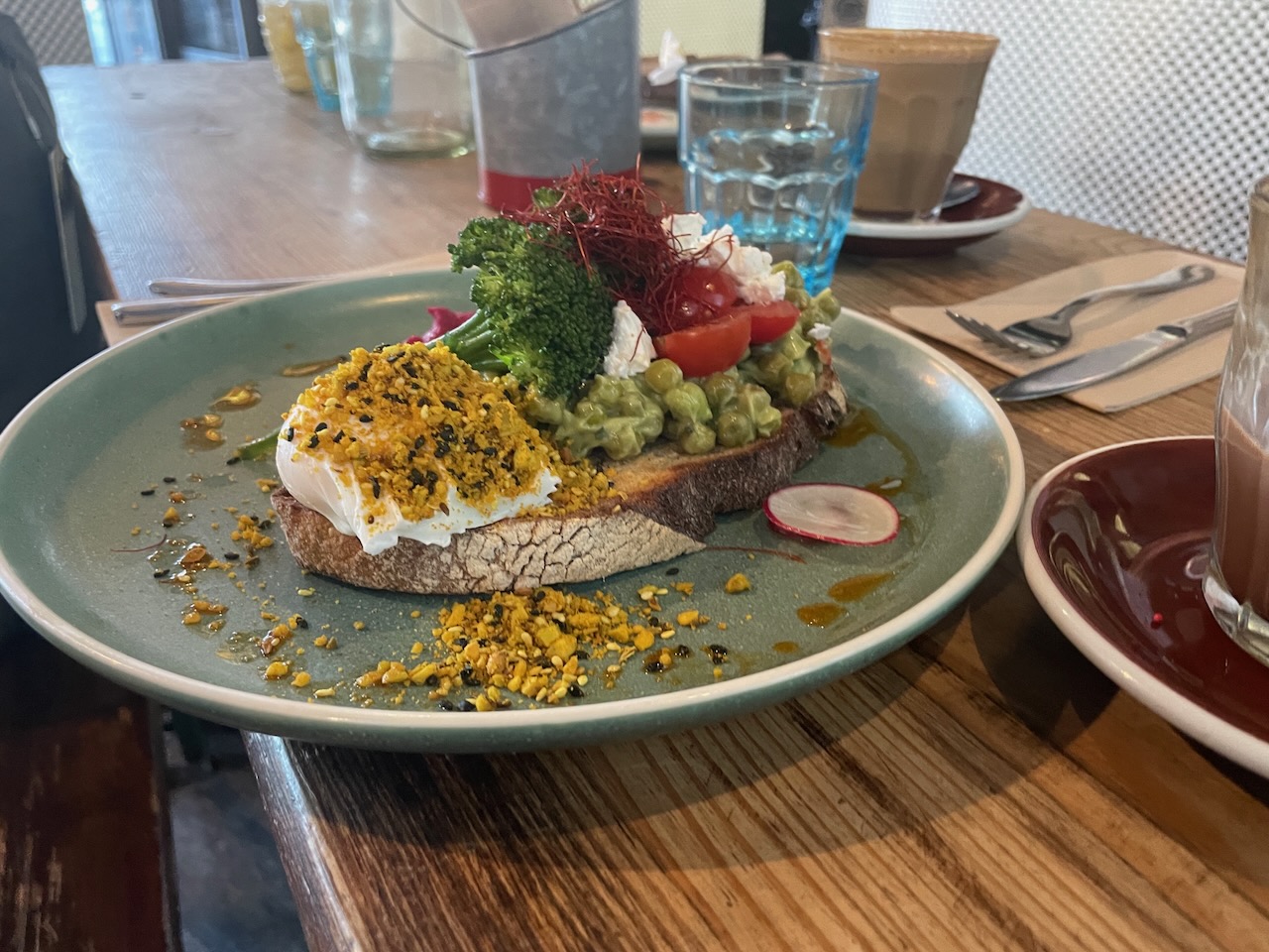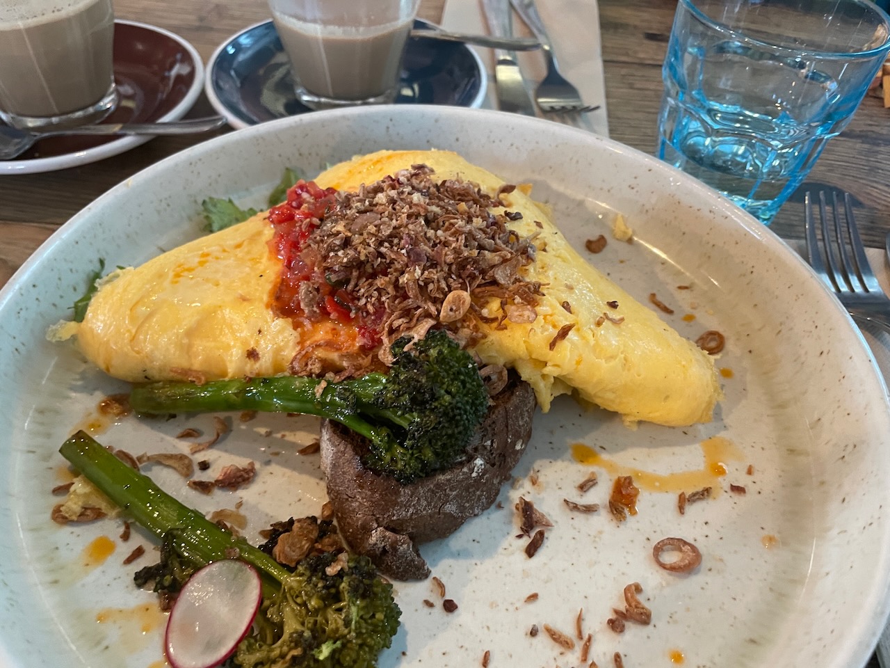 It was crowded when we arrived but we managed to get seated at a table large enough for all of us and we ordered, a latte apiece for Joanna and I (as we would discover, both here and in Australia, they don’t typically served brewed coffee as we know it. Almost all is an expresso drink of some fashion). Joanna went for the Beans is Beans (Pea and edamame beans with poached egg, feta, avocado, chili & mint, served with beetroot hummus on kumara sourdough with turmeric dukkah, seasonal greens, cherry tomatoes, chili hair and freeze-dried balsamic chunks, and manuka honey chunks) and I got the Fang Lemon Goat Cheese Omelet (Folded omelet filled with lemon goat cheese , arugula, cherry tomatoes, crispy shallots, baby carrots, roasted pepper salsa on Russian rye bread).
