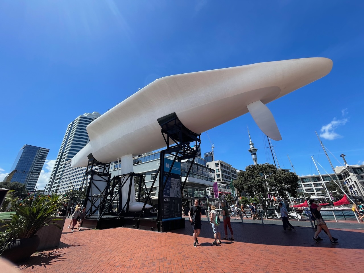 We walked west on Quay Street until we came to the New Zealand Maritime Museum. We decided to pass on the museum but did stop for a few moments to check out the display outside of the KZ1, a one-off sailing yacht built to challenge for the 1988 America’s Cup. She was designed by Bruce Farr and is constructed from a carbon fiber and Kevlar/Nomex sandwich.