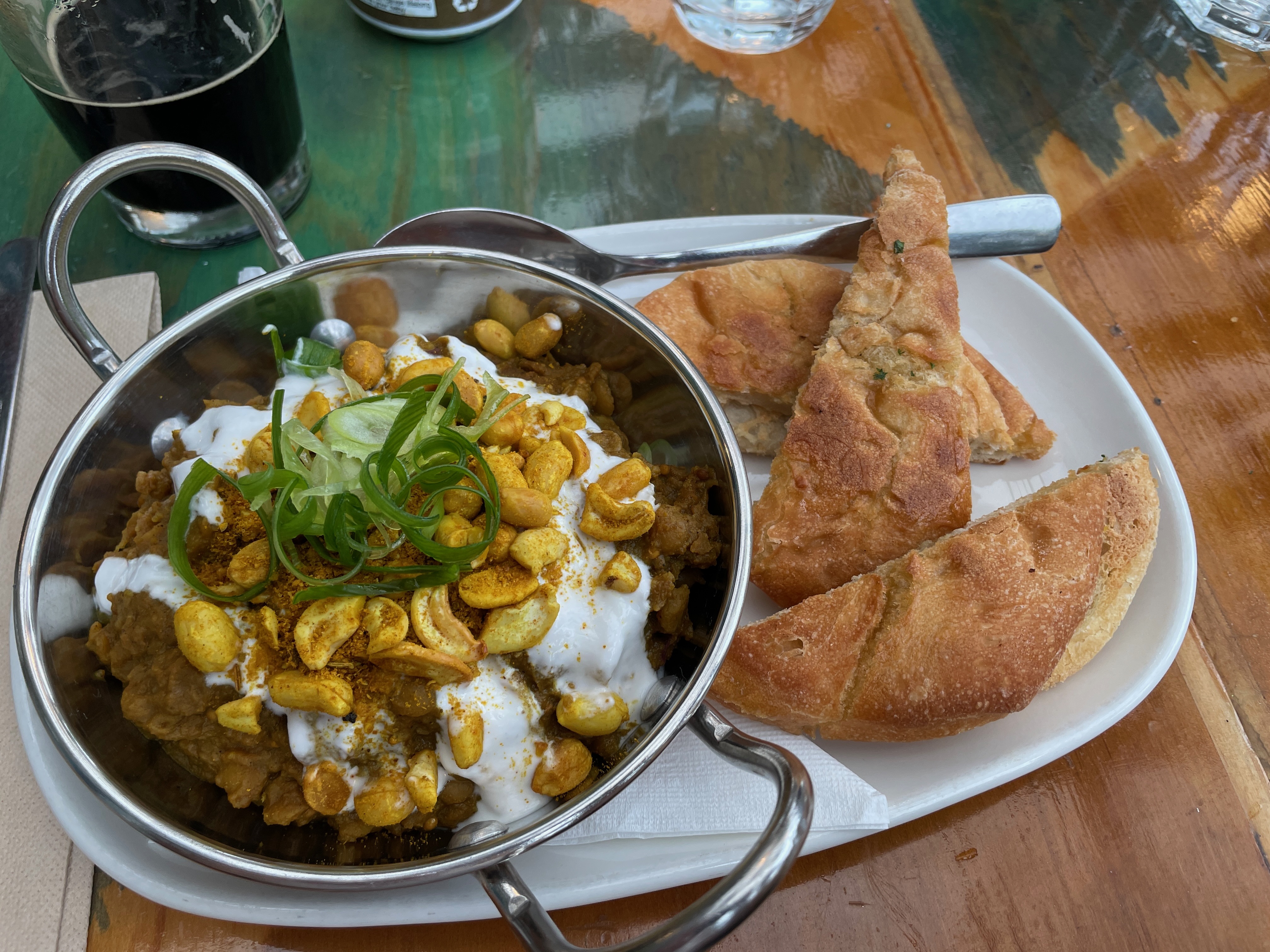 Seated at a large table on the patio, we learned that our waitress is Alice’s friend and our meal would subsequently be enlivened by their back-and-forth.  It would be good day for Joanna, as we were persuaded that ordering the café’s Cinnamonui Scrolls (Cinnamon Rolls) first would be the way to approach our meal.  And so, we did, and they were absolutely the best.  Along with a beer or two apiece, Joanna enjoyed a uniquely good Baby Dahl (Yellow split pea dahl with curried cashews, peanuts, sesame seeds, coconut cream, kaffir lime and spring onion) with flatbread.