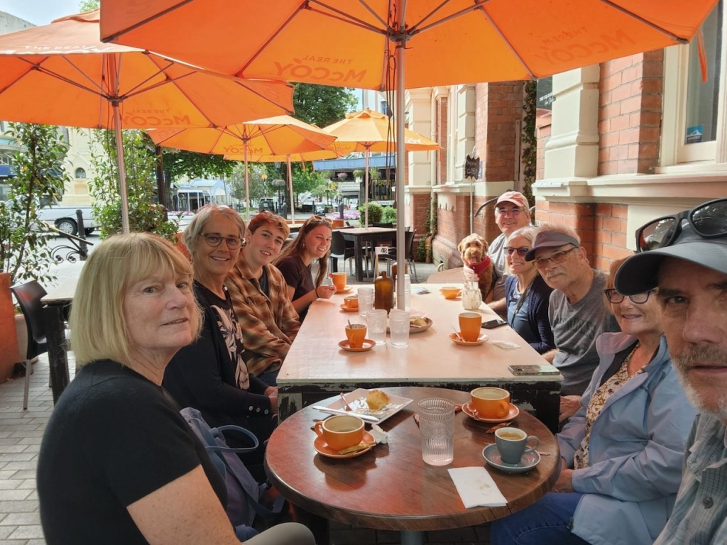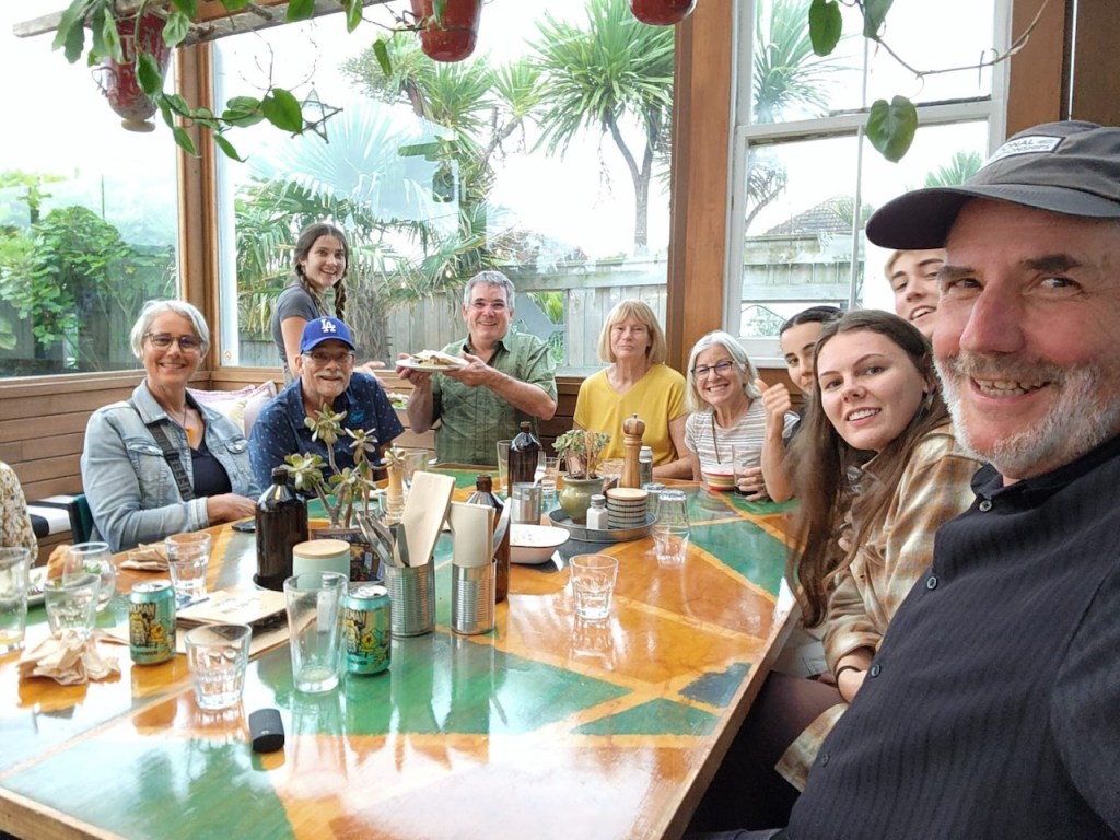 The storm broke into clear skies when we reached the bus stop in Whanganui and not long after, the Quigley’s, Kate, John, their son Angus (and his girlfriend Sophie) and daughter Alice pulled up in two cars to shuttle us to our Airbnb.  We quickly settled our gear and soon thereafter were picked up again and taken out to a neighborhood near the beach for dinner at the The Citadel Cafe