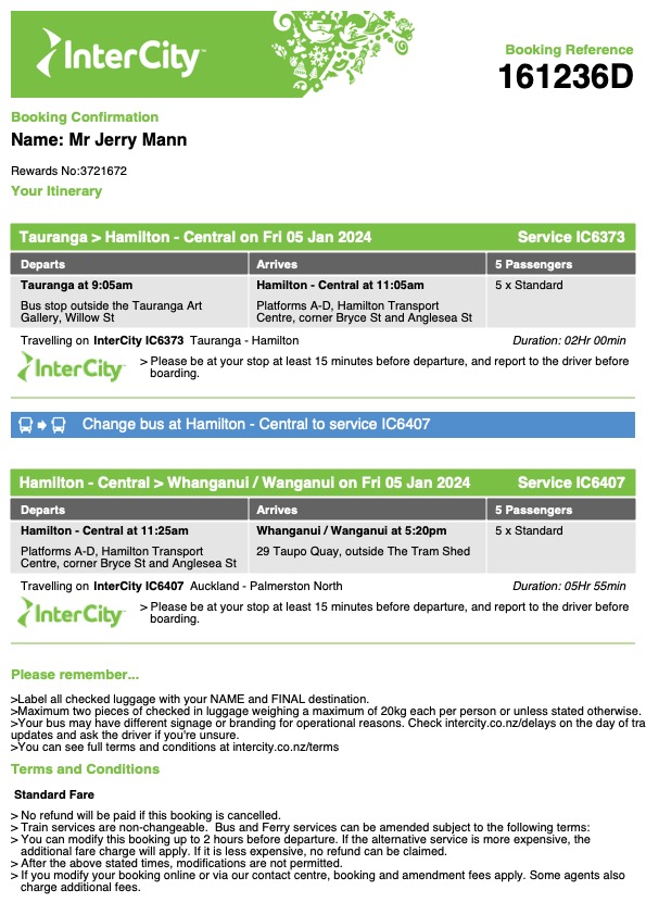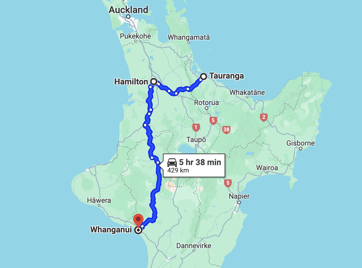 Our bus ride today would be one of the longest of the trip, requiring that we head west to Hamilton, and then turn south for Whanganui, our eventual destination.  It would take us over seven hours given the number of stops that the bus would be making along the way, including a 30-minute layover in Hamilton.  Beppie and Ian shuttled us to the main Tauranga bus stop where we boarded an almost completely full bus, forcing all of us to spilt up and grab whatever seat we could.