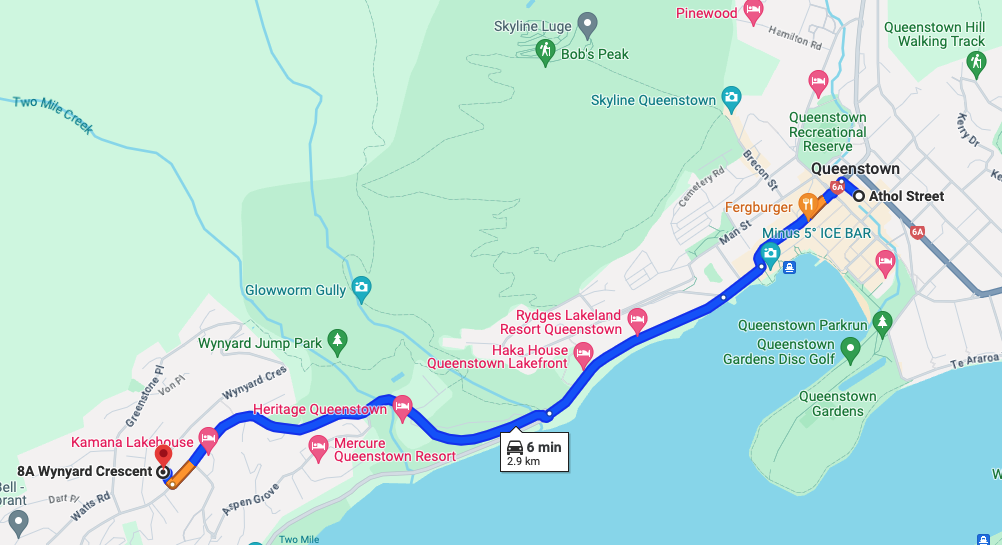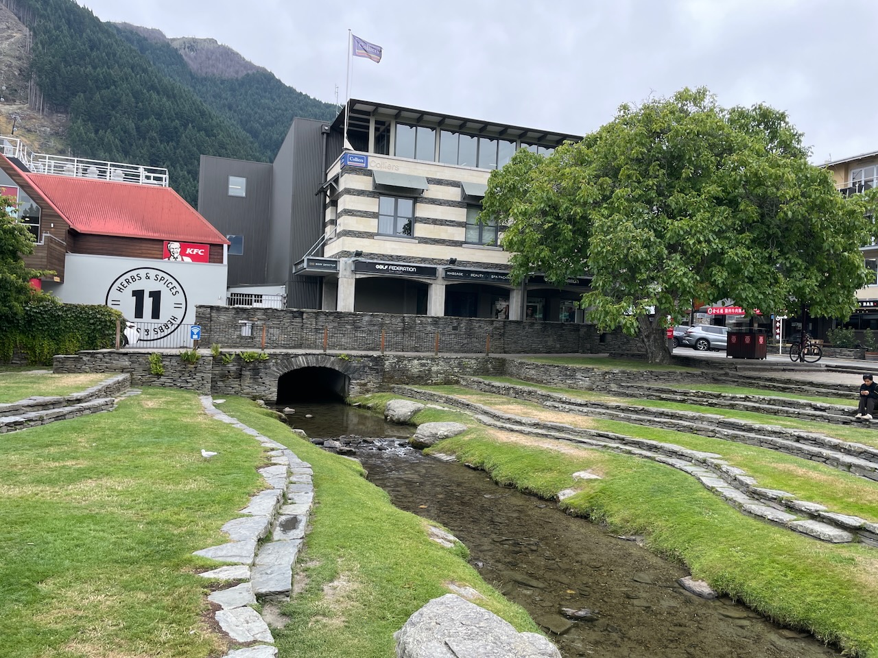 After passing though some lovely scenery and experiencing a wait in a long line of traffic entering the outskirts of Queenstown, we finally landed at the bus stop on Anthol Street, a half block off Gorge Road (which turns into Beach Street), the town’s main drag. The town is built around an inlet called Queenstown Bay on Lake Wakatipu, a long, thin, Z-shaped lake formed by glacial processes, and has views of nearby mountains such as The Remarkables, Cecil Peak, Walter Peak and just above the town, Ben Lomond and Queenstown Hill.