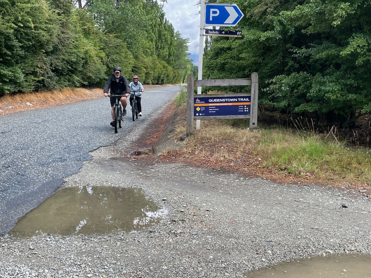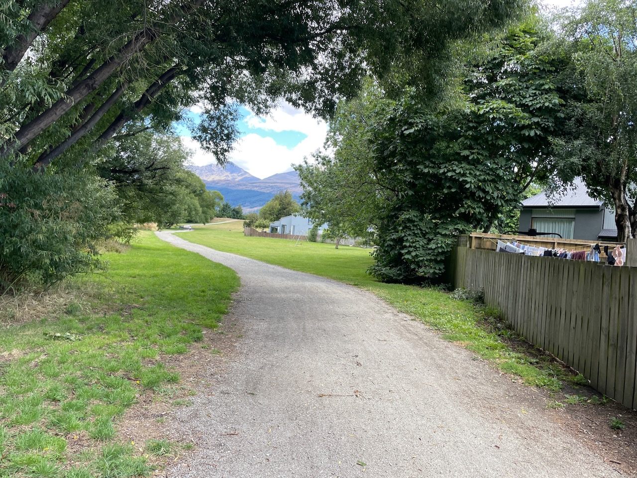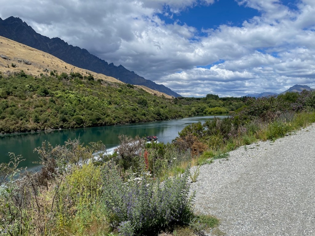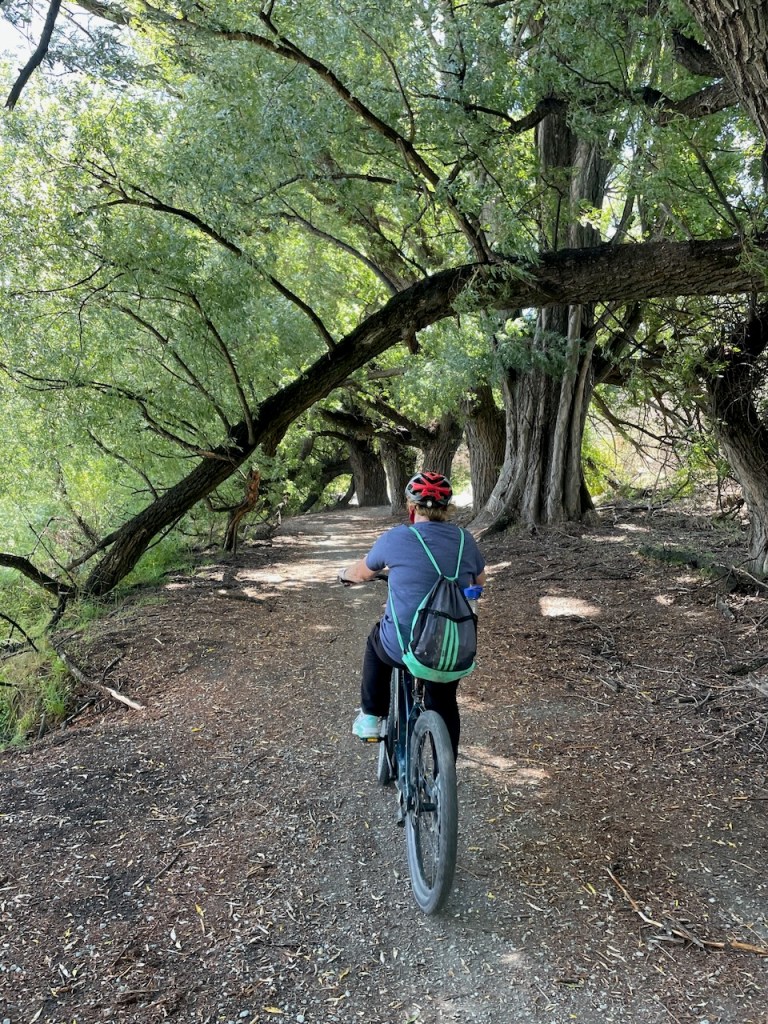 Along the way we enjoyed a clearly marked trail with good signage until about two thirds of the way we had a snafu at the Old Shotover Bridge. Instead of crossing it, we misunderstood the sign and instead dropped below the bridge and continued on a nicely shaded flat trail for some distance until we reached a junction that led to a very, very steep hill and a sign that indicated it would take us past Lake Hayes and back to Arrowtown.