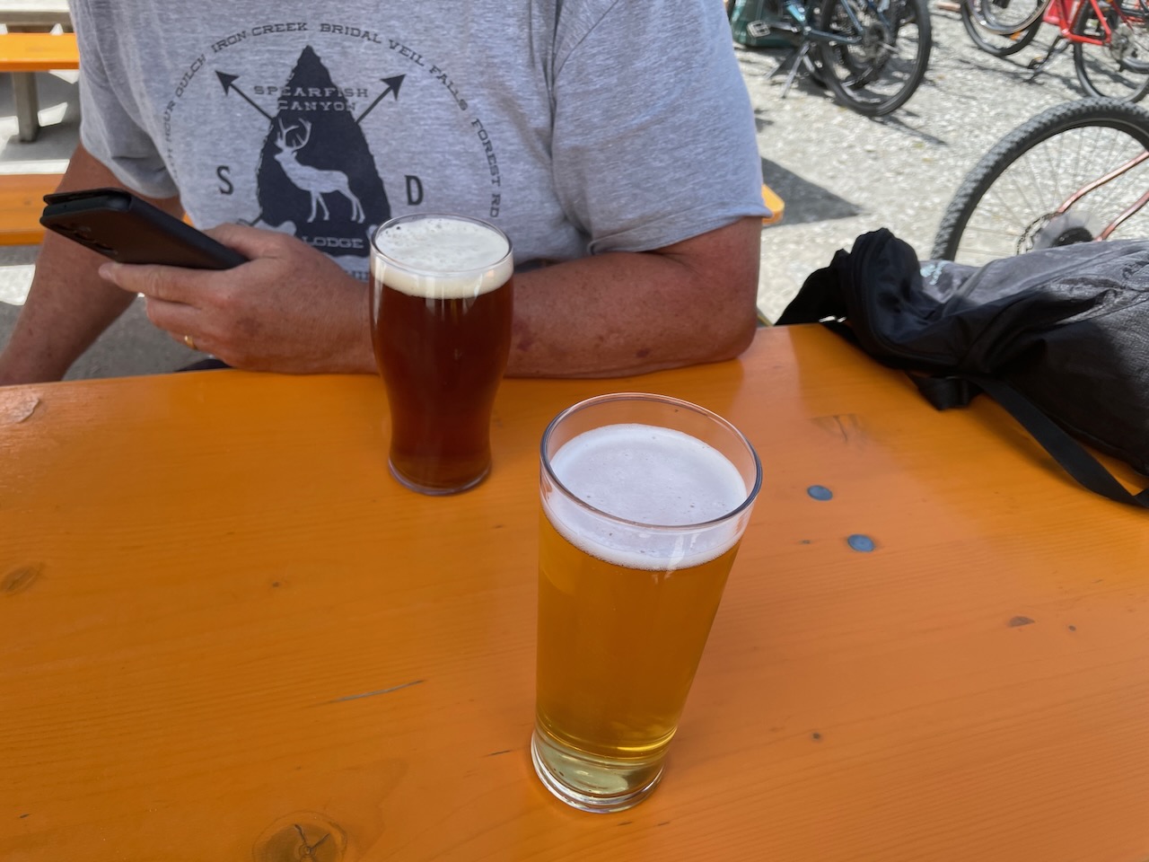 So, we turned around to the bridge where we realized our error and crossing over soon found ourselves riding on the banks of the Shotover River with magnificent views downstream towards Queenstown. This brought us into the outskirts of town and as we rode along a large inlet of Lake Whakatipu we spotted Altitude Brewing and since we were close to the end of the ride, decided to re-hydrate there.