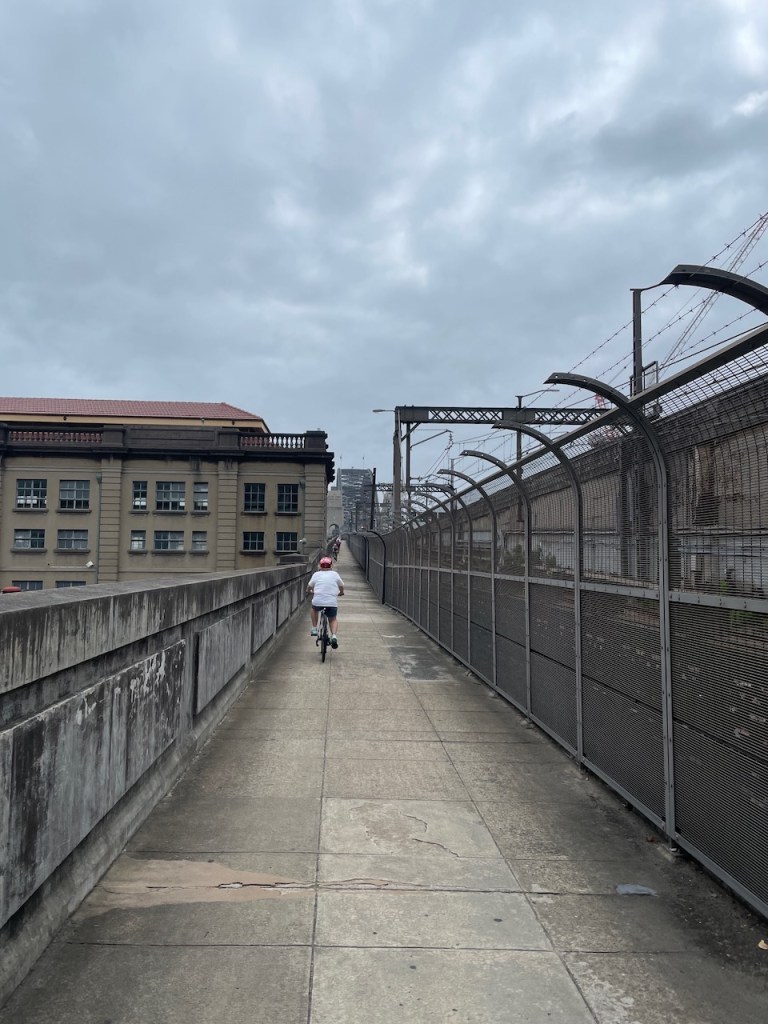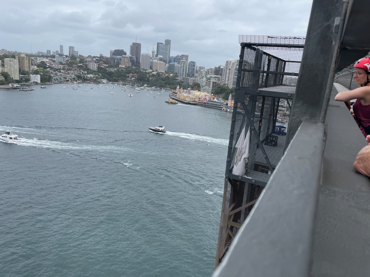 From there we rode to what would be one of the highlights of the tour, ascending one side of the Sydney Harbor Bridge to just about the midway point. It’s not much of a climb and the gears on our bikes were more than sufficient to handle the grade. The bridge had been a featured discussion in our planning about whether some members of the party would embark on one of its guided walking tours which have various levels of difficulty and perhaps, terror inducing exposure to heights. In the end, for all of us the bike tour seemed to be the safest, and least expensive option.