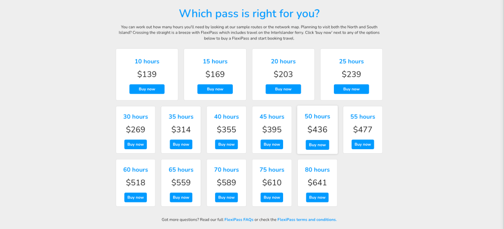 The second deviation from busses was booking the Coastal Pacific train from Picton to Christchurch through The Great Journeys of New Zealand site. This five-hour journey down the east coastline of the South Island offered us scenery up the Yazoo, comfortable seats, freedom to move around, and access to food and drink, all for an initial cost of $108 (fares since seem to have gone up). More expensive than the bus would have been, but the additional cost was well worth the money.