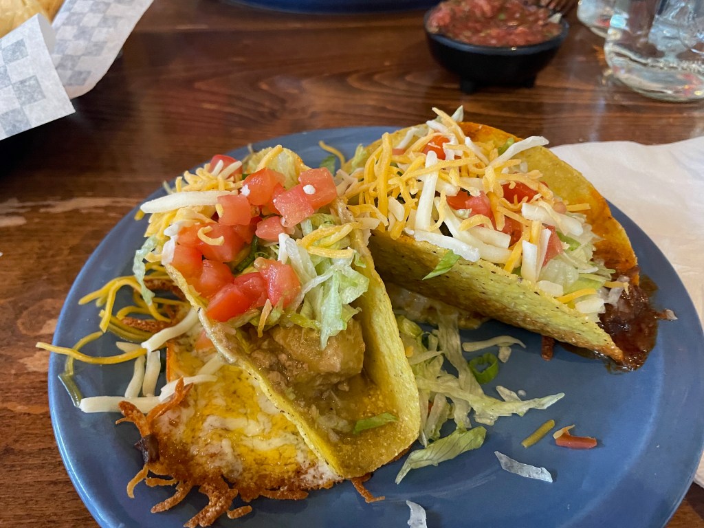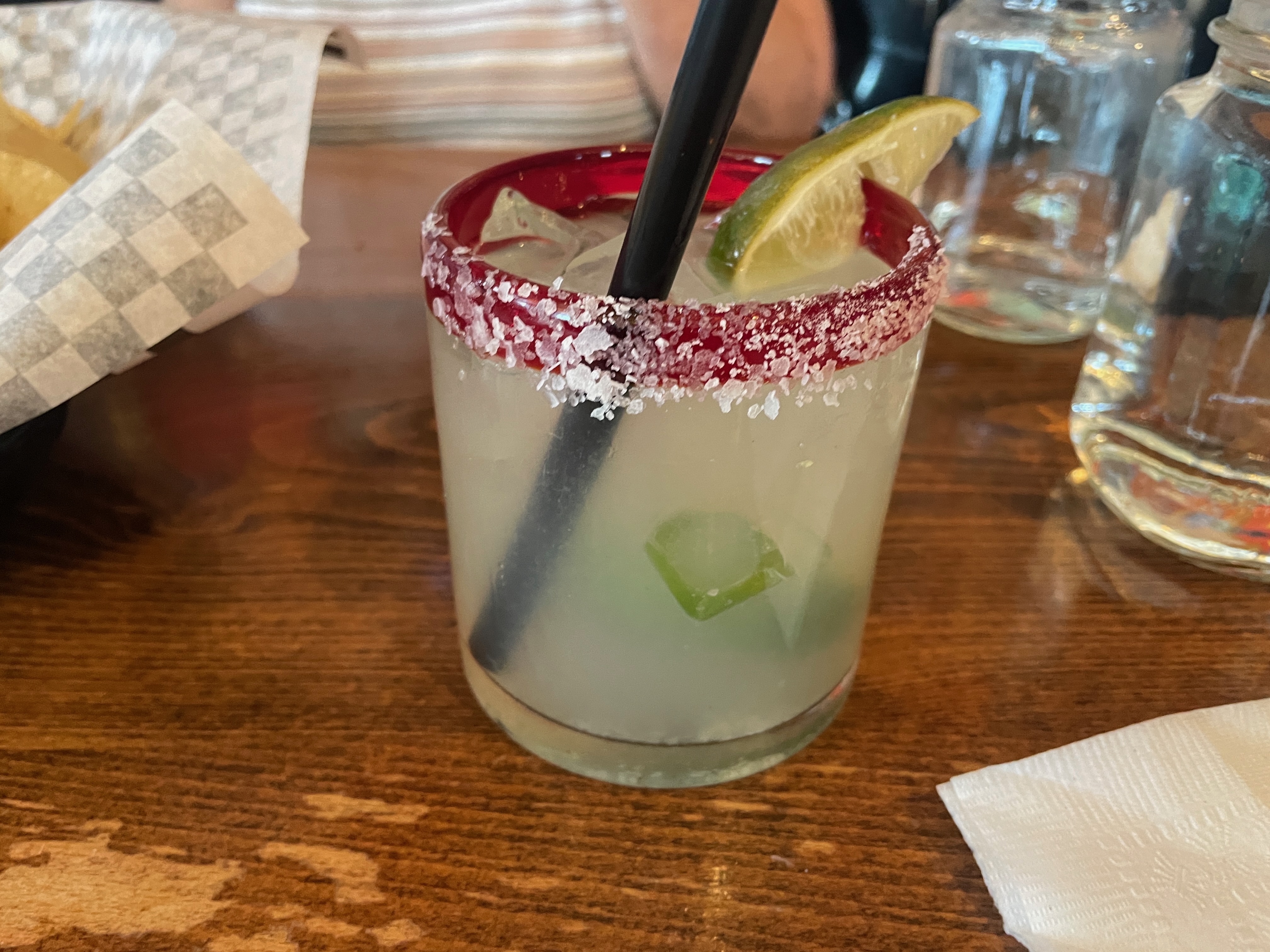 He apologized profusely and service improved markedly after that, in fact he would comp us a drink at the end of the meal. We started with margaritas, the El Patron Margarita (Patron, Cointreau, half of a lime, a splash of house mix, and Grand Marnier on the rocks) for me and a Mango Chili for Joanna. She ordered the Posole (homemade green chili pork posole, topped with cilantro, served with rice, beans, purple cabbage and a warm flour tortilla) and not bring terribly hungry, I just got two crispy tacos, red chili beef and one green chili pork.