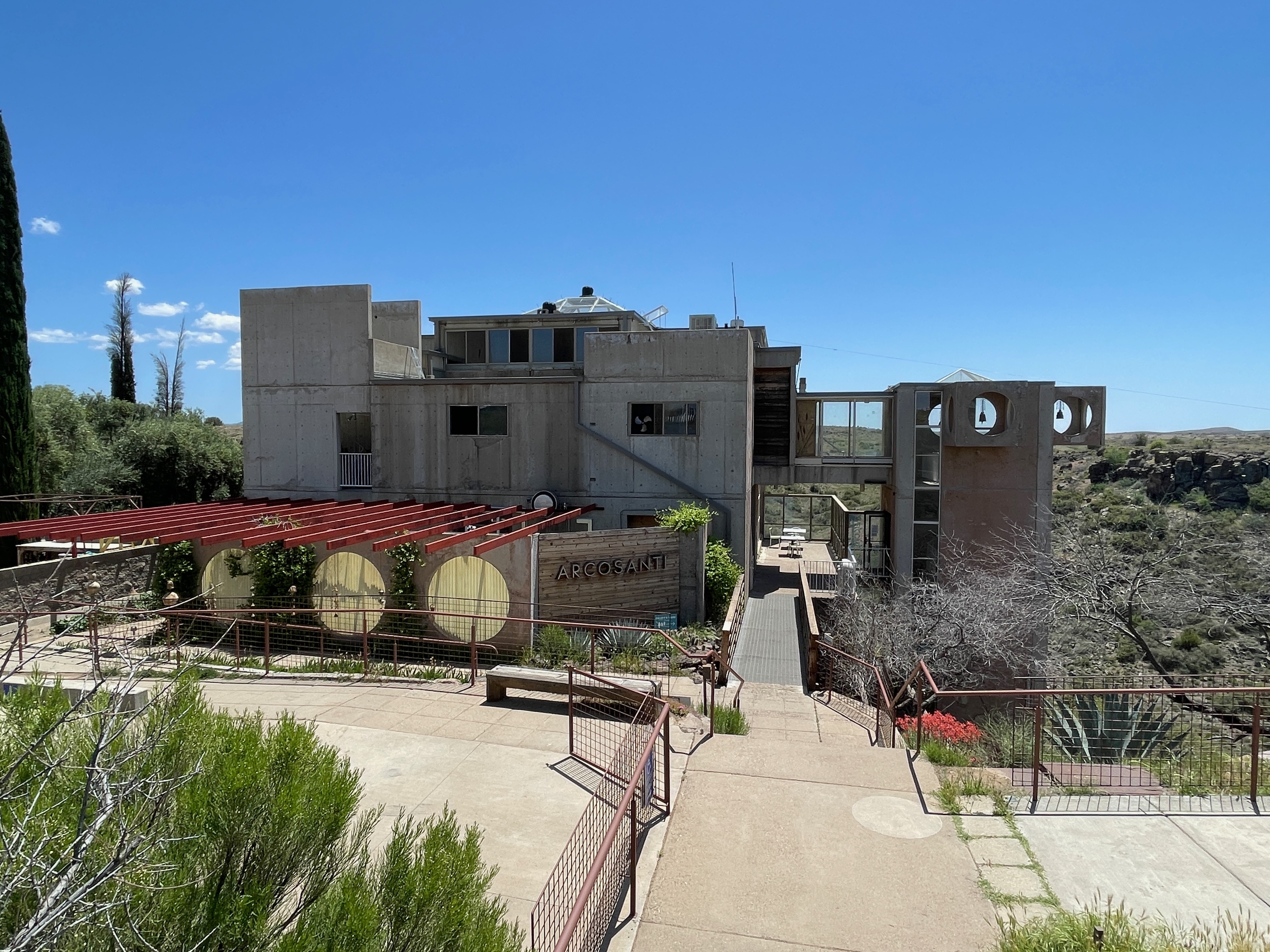 It was all very good and quite filling and except for the service glitch (our second in a row) we were happy with the meal, closing out the tab at $52 including the tip, but minus one drink. Another quiet evening at the house left us ready for our four drive south to Tucson the next day. We made a stop partway down at Arcosanti, which we have visited off and on over the course of our many years of travel in this part of the country. An experimental town with a bronze bell casting business, Its arcology concept (which combines architecture and ecology) was proposed by Italian American architect Paolo Soleri (1919–2013). He began construction in 1970 to demonstrate how urban conditions could be improved while minimizing the destructive impact on the Earth. He taught and influenced generations of architects and urban designers who studied and worked with him there to build the proposed town.
