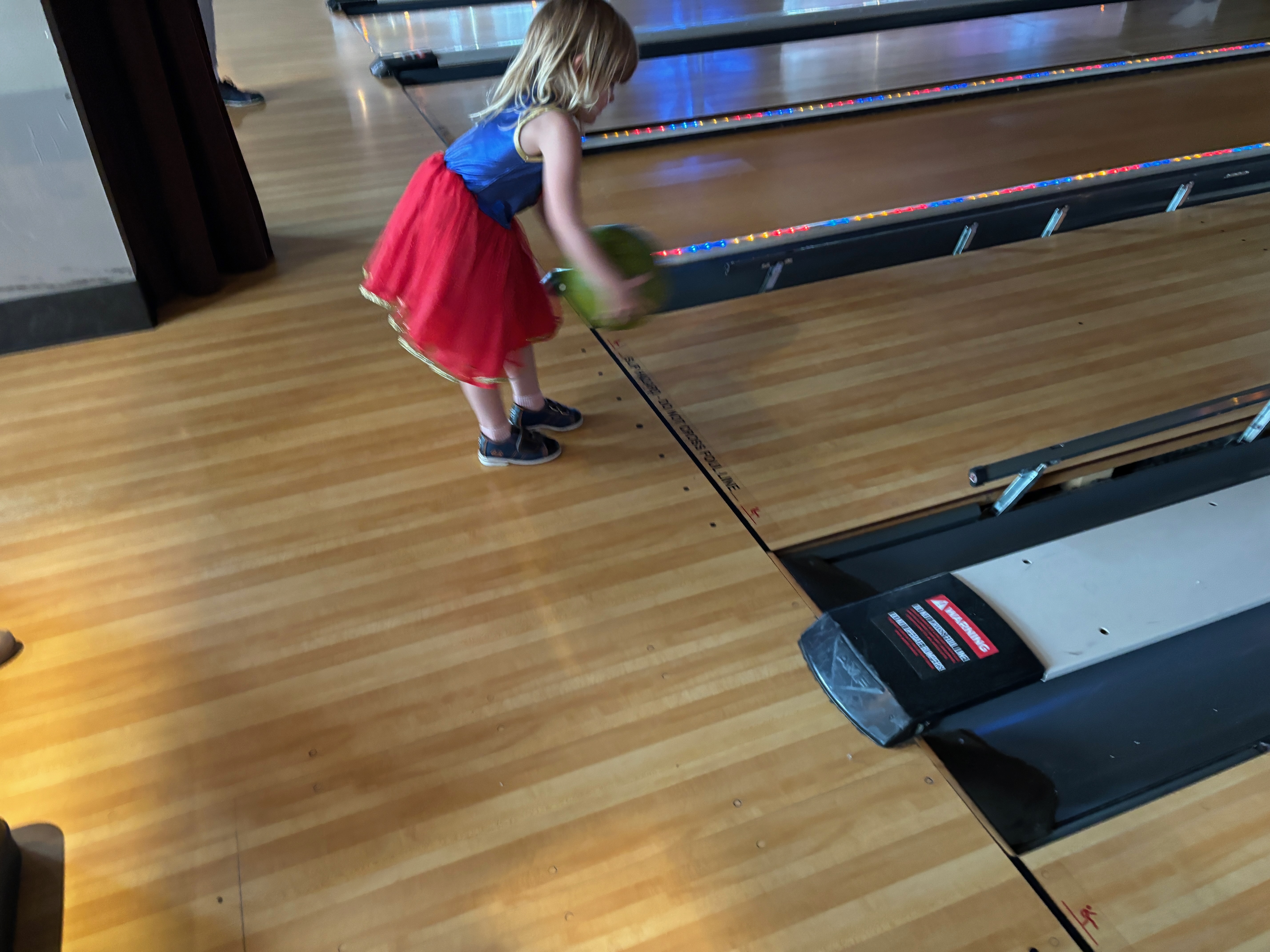 We were there because John, a good friend of the kids, whose company had booked the venue for an employee event, let them know there was confusion with the date and no one from the business could attend. Thus, we got to do so instead. We’d have a few hours there to bowl and eat a supplied buffet of pub food and free drinks. It would be the first time bowling for Gemma and three her pals from day-care, an activity they all seemed to enjoy.