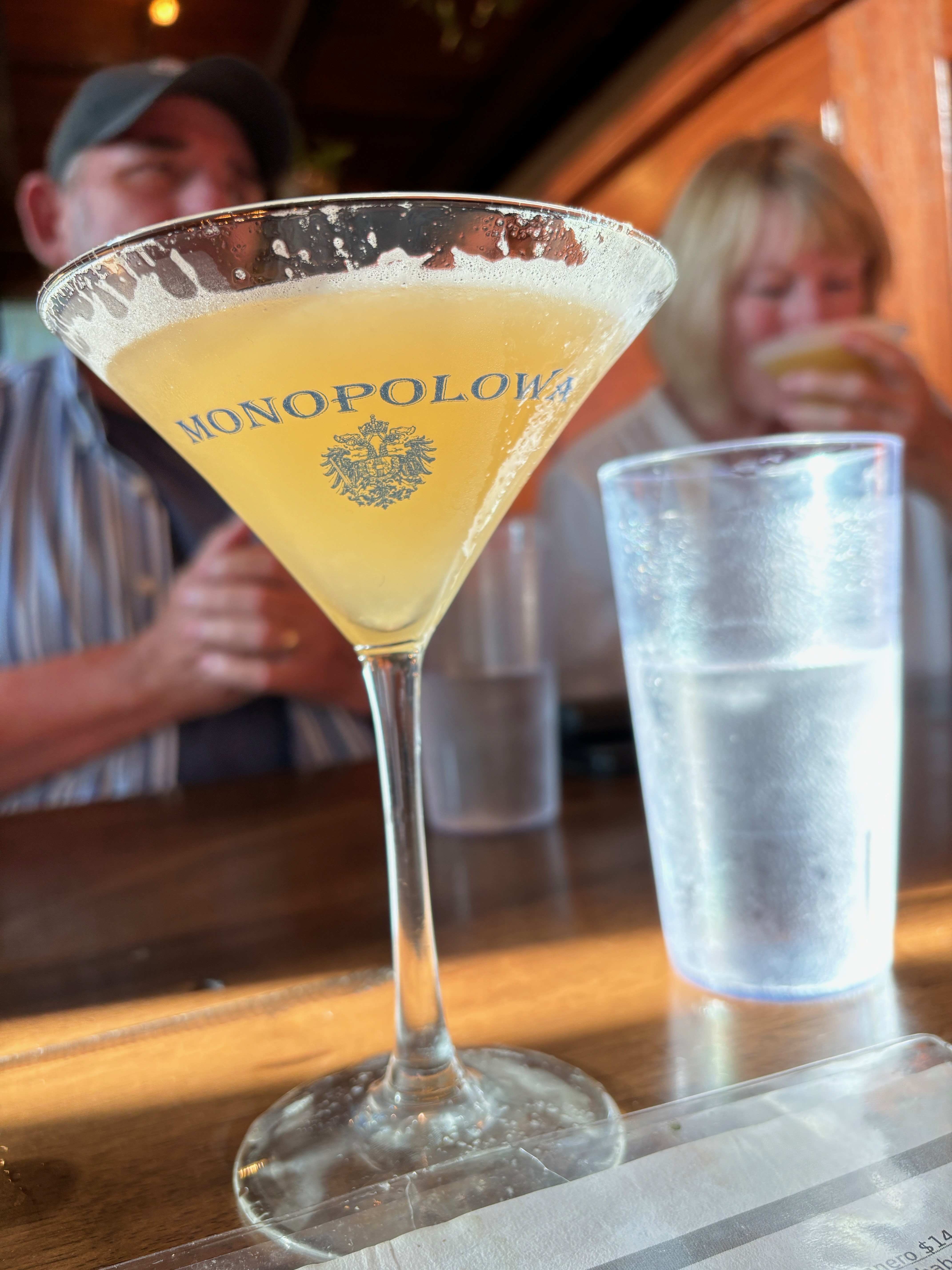 After checking in at the hotel, we enjoyed a drink with Kim and Marty and then drove into Ojai for dinner at the Ojai Beverage Company, a wine, beer and liquor emporium that also operates a restaurant. After we were seated, we ordered a cocktail apiece, for me the Mullholand Sunset (Mullholand Gin, Vida Mezcal, lemon juice, pineapple juice, and angostura bitters) while Joanna enjoyed The Empress (Empress Gin, cucumber, agave nectar, and lime juice).