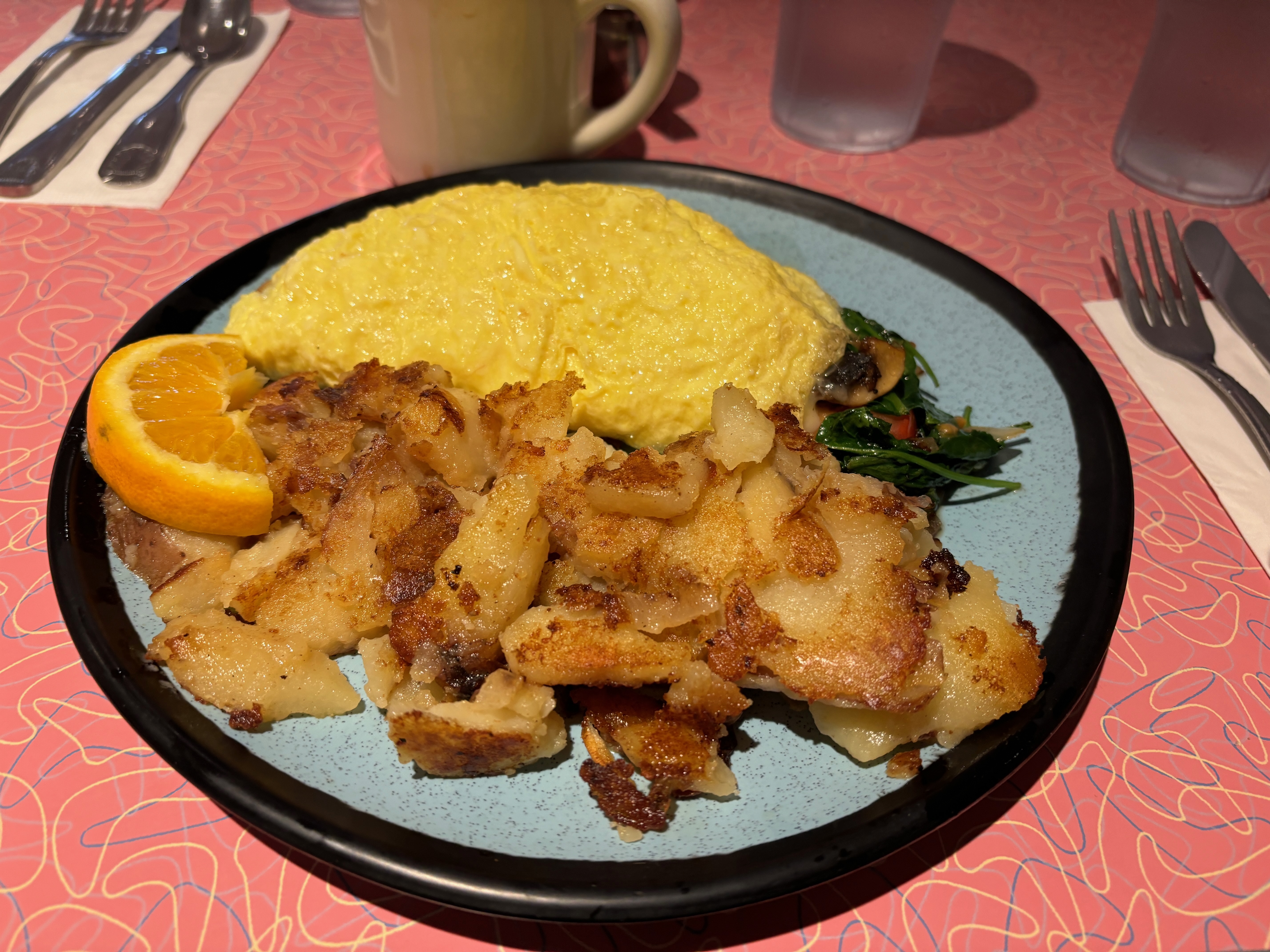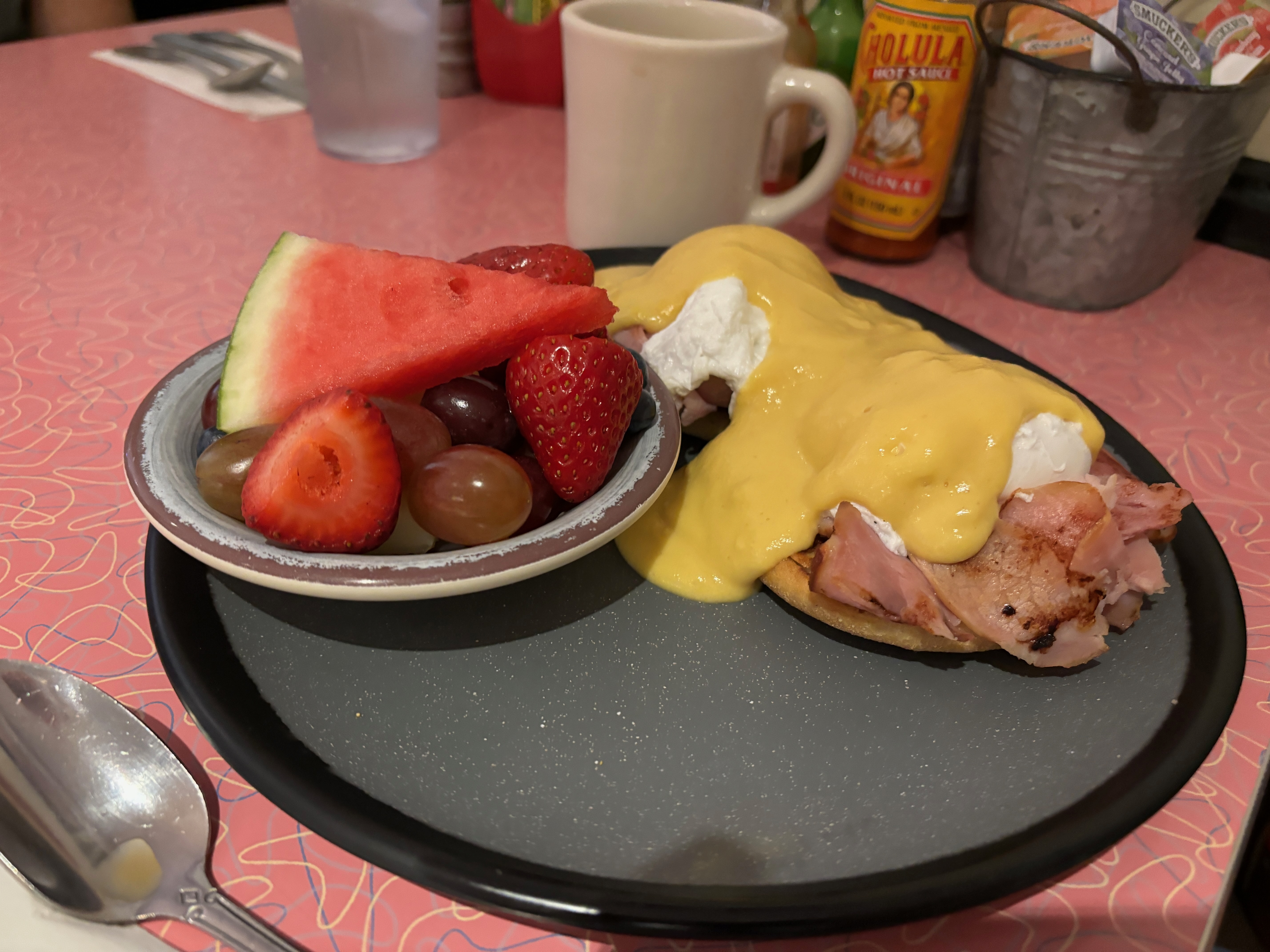 We closed out our stay the next morning with breakfast in Ojai at Bonnie Lu’s Country Café in the heart of town. Along with our coffees, Joanna ordered Walter’s Egg Benedict (English Muffin, two poached eggs and ham topped with Hollandaise Sauce) while I went for the usual, Shelly’s Veggie (Tomato, mushroom, spinach, onions, and Swiss cheese). While the food was quite good, prices were steep with both our choices coming in at $21 apiece, making for a $60 meal once you add in tax and tip.