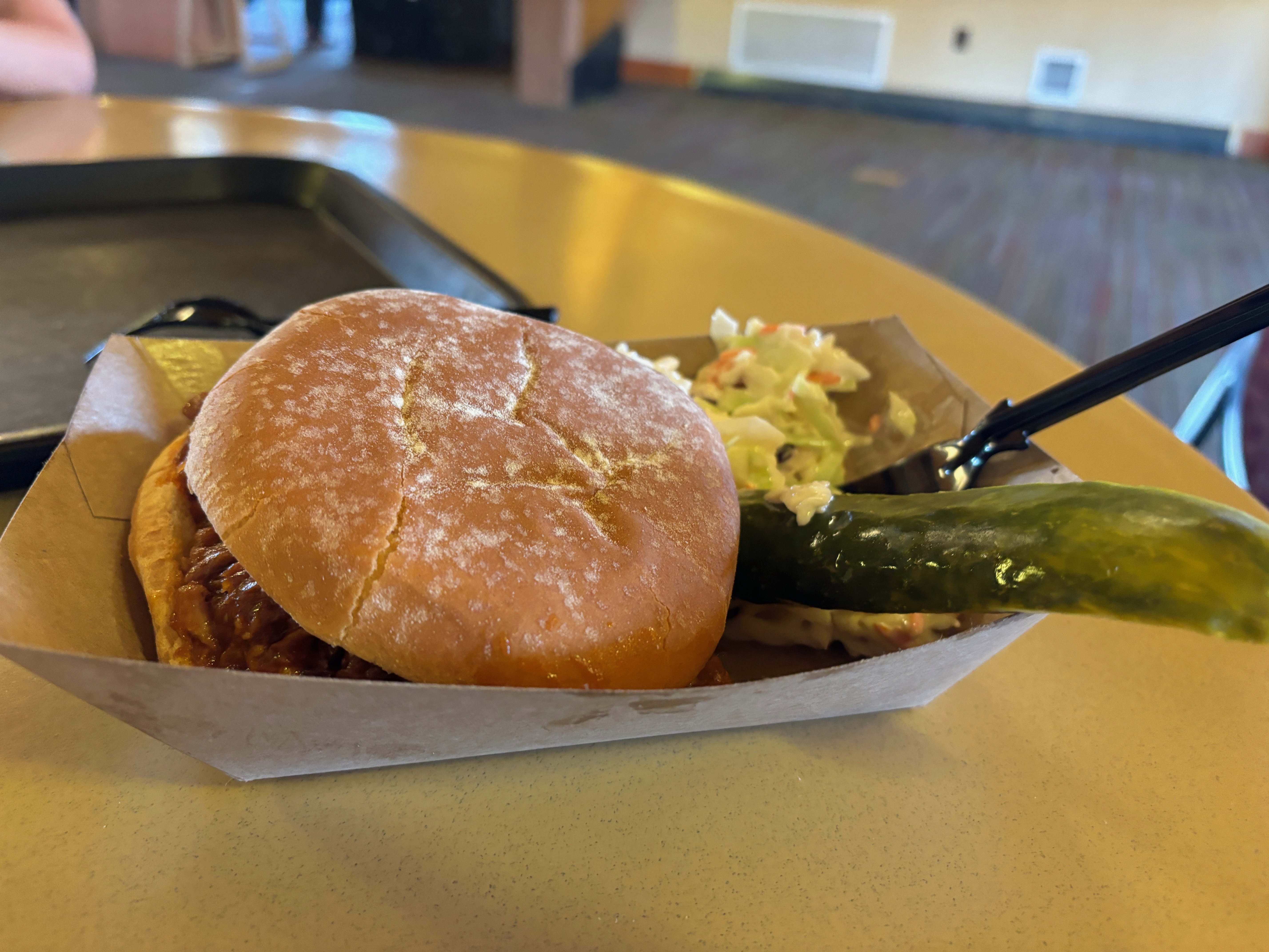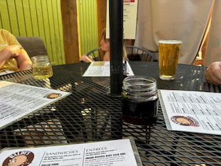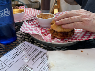 To celebrate Chuck’s birthday, we took him to one of his favorite restaurants, the original location of Baldy’s BBQ. It’s a casual place and we found seats on the patio where we would enjoy a glass or two of house wine while Joanna and I split a Rib and Brisket combo with beans and corn pudding along with an additional side of au gratin potatoes for the table. Chuck enjoyed his pulled pork sandwich as well, a nice way to finish our enjoyable stay with him in Bend.