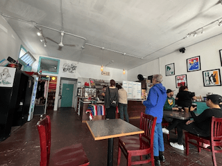 The next morning, we convened at Hasta Muerta Coffee, a favorite empanada place in walking distance from the house. It is run as a collective which aims to “support all efforts to maintain life and living for the dispossessed in places like Oakland, in which landlords, developers, and high cost of living push low-income people like us to the margins”. The food and coffee are excellent, so it is easy to encourage their efforts by eating and drinking there.