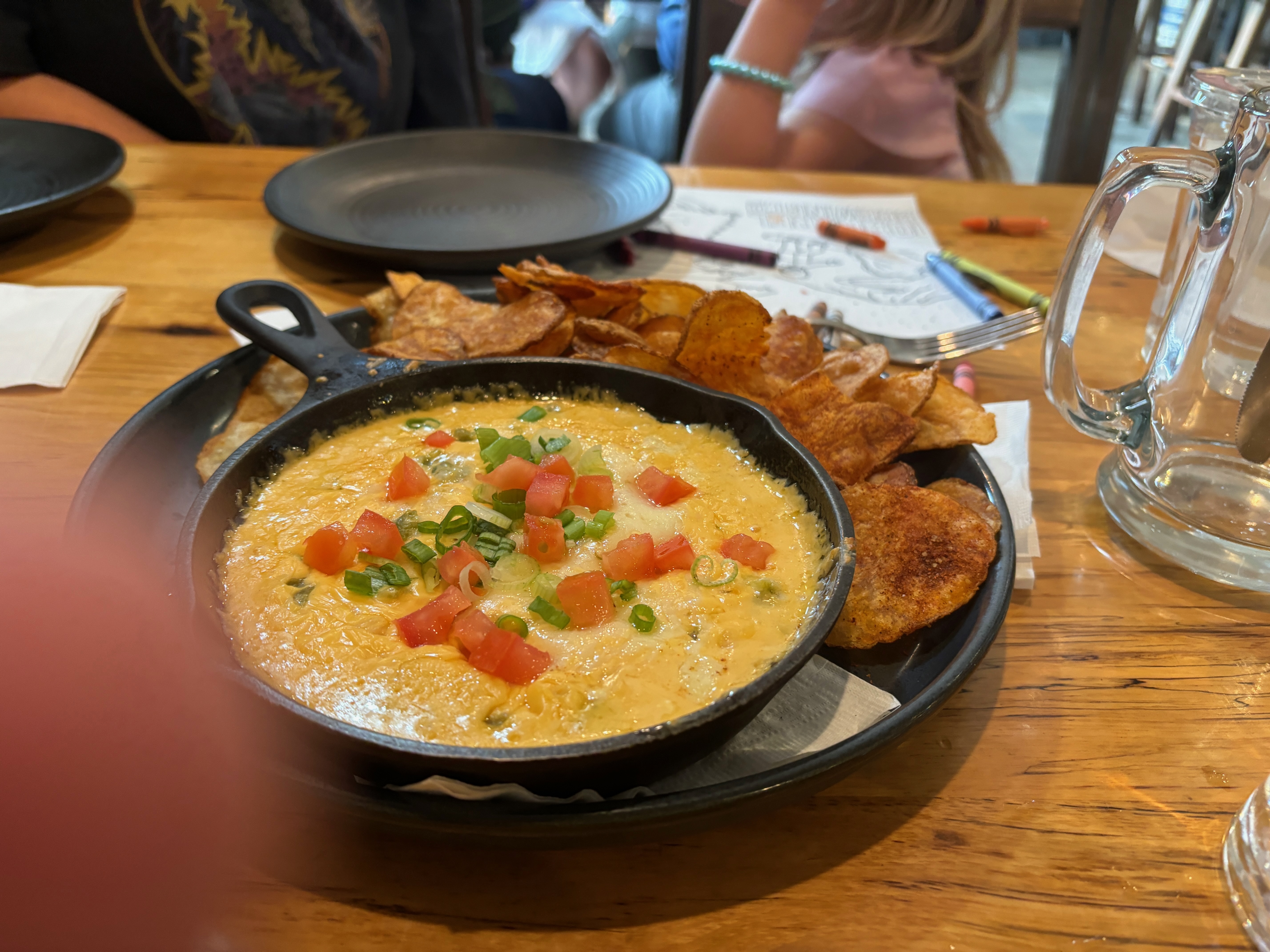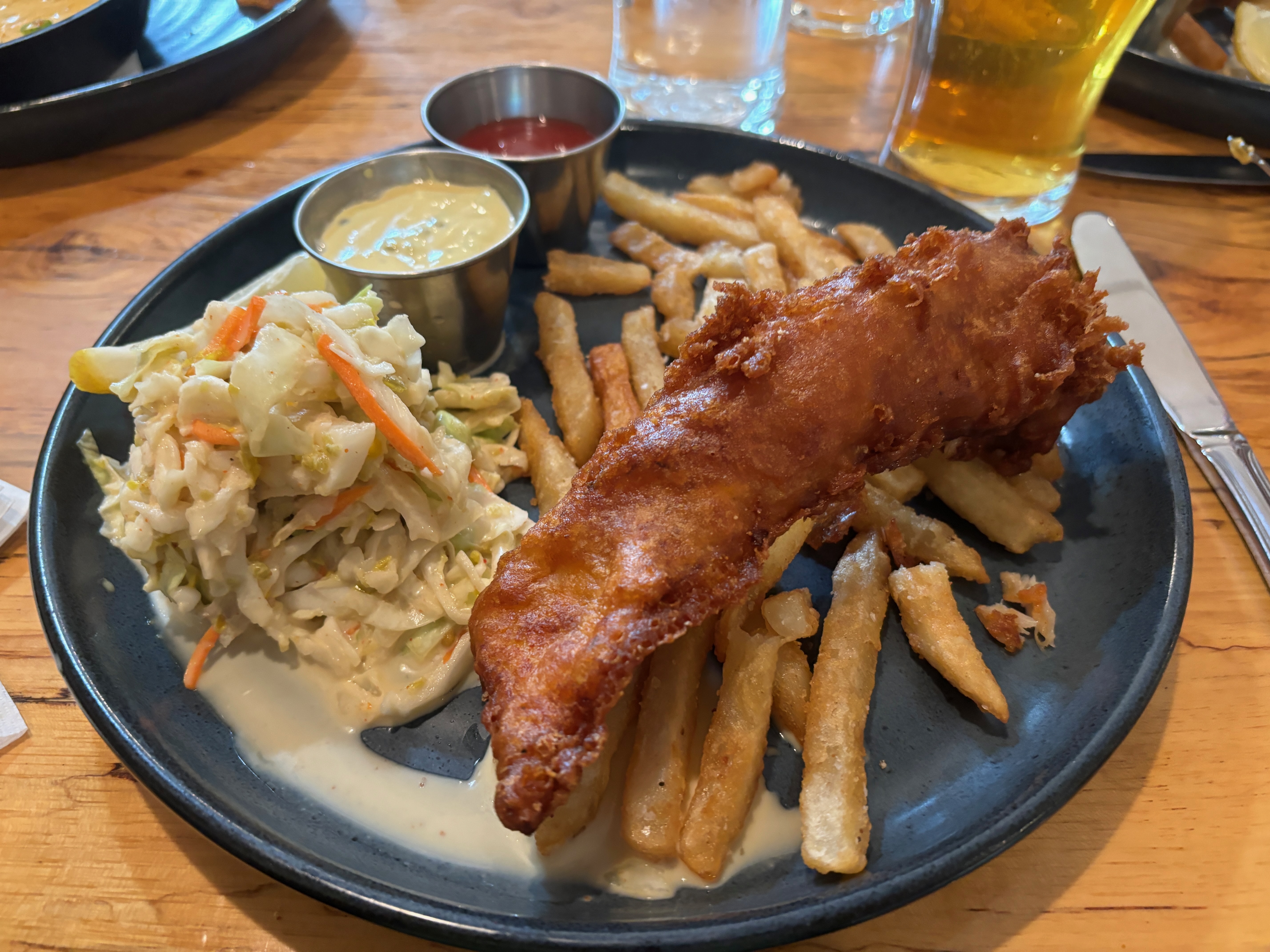 Seated inside we enjoyed a first round of beers and an order of Smoked Queso, a delightful blend of smoked cheese, diced jalapeno, tomato, and green onion that we ate with house made potato chips. Joanna and I then split, as usual here, the Oregon Rockfish and chips with a jalapeno slaw, more than enough for the two of us, especially after powering through the cheese dip.