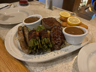 We’d not had German food in some time and were having difficulty trying to narrow down our options when the solution hit us, we’d just order the Combo Platter for Two with Beef Filet Medallions, Schnitzel, Nürnberger Grillbratwurst, Spätzle, Potato Salad, Sauerkraut, Apple-Flavored Red Cabbage and Green Beans wrapped in Bacon. For us, the star of the show would be the Nurnberger sausages, which we seek out whenever we eat this cuisine, taking us back to that walled city in the south of the country.