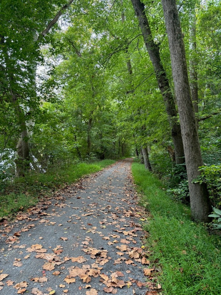 This being only my second bike ride since June and remembering how badly the first one went in Kansas City, I just wanted to get in ten easy miles or so, and we were able to accomplish that. The path is smooth and flat which makes sense as it follows the canal. Like other former rail trails, this one leads you through a tunnel of trees and other foliage, the remains of the canal just off to the side.
