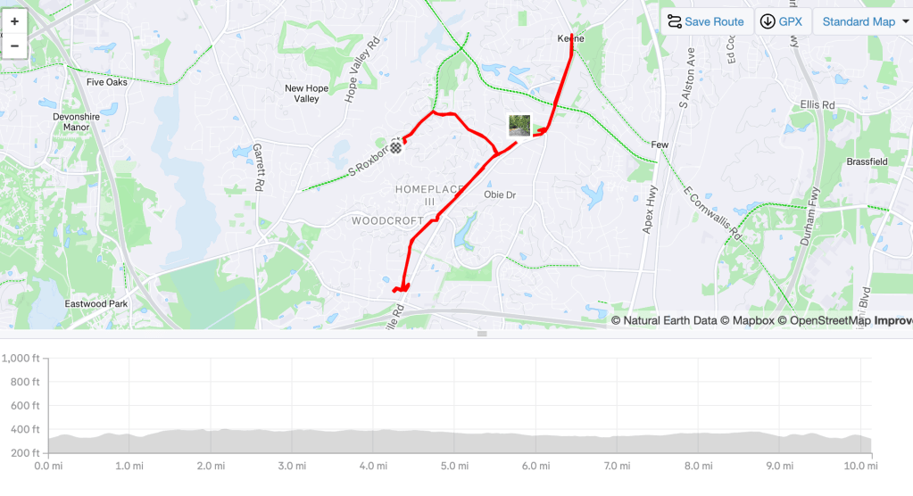 We stayed close to the house the next day as Durham got hit with heavy rain due to the hurricane that passed west of town and devastated North Carolina mountain towns like Asheville. By Saturday the skies had cleared and so we ventured out for a bike ride on the nearby American Tobacco Trail. We’d end up on the trail twice given its convenience and relatively easy profile, but the first time is always a little surprising as one doesn’t really know what to expect. In this case, being a Saturday it was busy with other folks out exercising and covered in lots of wind-blown debris. But fun to ride none the less.